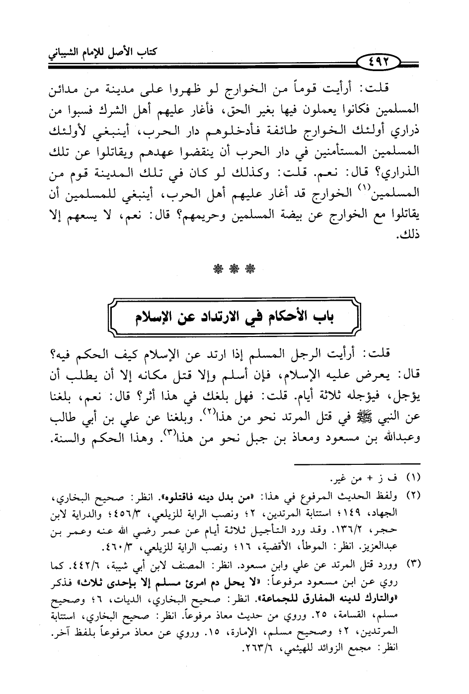 (¬2) ولفظ الحديث المرفوع في هذا: "من بدل دينه فاقتلوه". انظر: صحيح البخاري، الجهاد، 149؛ استتابة المرتدين، 2؛ ونصب الراية للزيلعي، 3/ 456؛ والدراية لابن حجر، 2/ 136. وقد ورد التأجيل ثلاثة أيام عن عمر - رضي الله عنه - وعمر بن عبد العزيز. انظر: الموطأ، الأقضية، 16؛ ونصب الراية للزيلعي، 3/ 460.