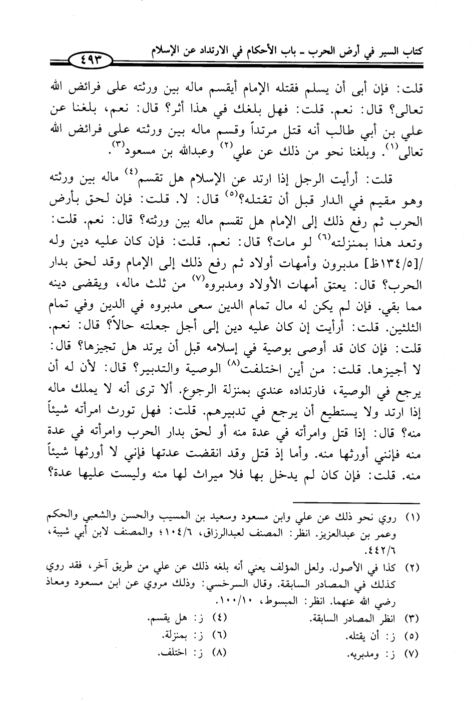 قلت: فإن أبى أن يسلم فقتله الإمام أيقسم ماله بين ورثته على فرائض الله تعالى؟ قال: نعم. قلت: فهل بلغك في هذا أثر؟ قال: نعم، بلغنا عن علي بن أبي طالب أنه قتل مرتداً وقسم ماله بين ورثته على فرائض الله تعالى (¬1). وبلغنا نحو من ذلك عن علي (¬2) وعبد الله بن مسعود (¬3).