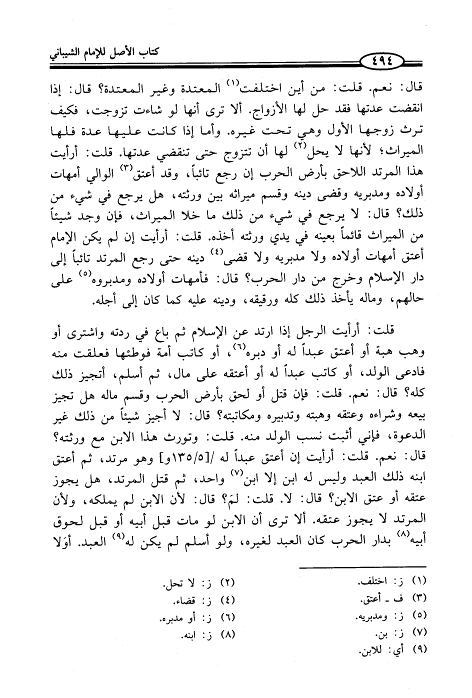 قال: نعم. قلت: من أين اختلفت (¬1) المعتدة وغير المعتدة؟ قال: إذا انقضت عدتها فقد حل لها الأزواج. ألا ترى أنها لو شاءت تزوجت، فكيف ترث زوجها الأول وهي تحت غيره. وأما إذا كانت عليها عدة فلها الميراث؛ لأنها لا يحل (¬2) لها أن تتزوج حتى تنقضي عدتها. قلت: أرأيت هذا المرتد اللاحق بأرض الحرب إن رجع تائباً، وقد أعتق (¬3) الوالي أمهات أولاده ومدبريه وقضى دينه وقسم ميراثه بين ورثته، هل يرجع في شيء من ذلك؟ قال: لا يرجع في شيء من ذلك ما خلا الميراث، فإن وجد شيئاً من الميراث قائماً بعينه في يدي ورثته أخذه. قلت: أرأيت إن لم يكن الإمام أعتق أمهات أولاده ولا مدبريه ولا قضى (¬4) دينه حتى رجع المرتد تائباً إلى دار الإسلام وخرج من دار الحرب؟ قال: فأمهات أولاده ومدبروه (¬5) على حالهم، وماله يأخذ ذلك كله ورقيقه، ودينه عليه كما كان إلى أجله.