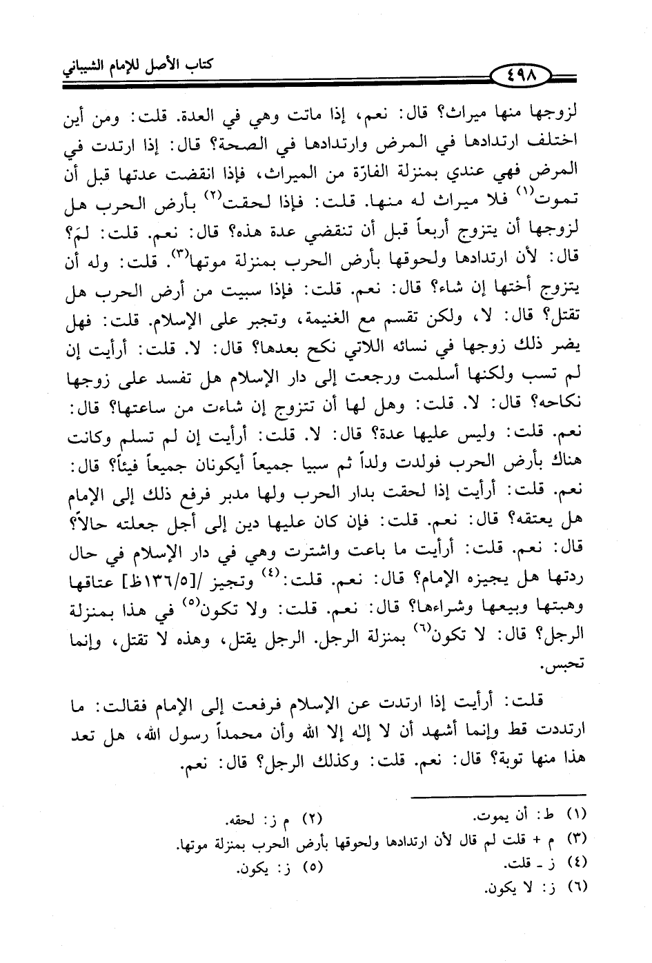 لزوجها منها ميراث؟ قال: نعم، إذا ماتت وهي في العدة. قلت: ومن أين اختلف ارتدادها في المرض وارتدادها في الصحة؟ قال: إذا ارتدت في المرض فهي عندي بمنزلة الفارّة من الميراث، فإذا انقضت عدتها قبل أن تموت (¬1) فلا ميراث له منها. قلت: فإذا لحقت (¬2) بأرض الحرب هل لزوجها أن يتزوج أربعاً قبل أن تنقضي عدة هذه؟ قال: نعم. قلت: لمَ؟ قال: لأن ارتدادها ولحوقها بأرض الحرب بمنزلة موتها (¬3). قلت: وله أن يتزوج أختها إن شاء؟ قال: نعم. قلت: فإذا سبيت من أرض الحرب هل تقتل؟ قال: لا، ولكن تقسم مع الغنيمة، وتجبر على الإسلام. قلت: فهل يضر ذلك زوجها في نسائه اللاتي نكح بعدها؟ قال: لا. قلت: أرأيت إن لم تسب ولكنها أسلمت ورجعت إلى دار الإسلام هل تفسد على زوجها نكاحه؟ قال: لا. قلت: وهل لها أن تتزوج إن شاءت من ساعتها؟ قال: نعم. قلت: وليس عليها عدة؟ قال: لا. قلت: أرأيت إن لم تسلم وكانت هناك بأرض الحرب فولدت ولداً ثم سبيا جميعاً أيكونان جميعاً فيئاً؟ قال: نعم. قلت: أرأيت إذا لحقت بدار الحرب ولها مدبر فرفع ذلك إلى الإمام هل يعتقه؟ قال: نعم. قلت: فإن كان عليها دين إلى أجل جعلته حالاً؟ قال: نعم. قلت: أرأيت ما باعت واشترت وهي في دار الإسلام في حال ردتها هل يجيزه الإمام؟ قال: نعم. قلت: (¬4) وتجيز عتاقها وهبتها وبيعها وشراءها؟ قال: نعم. قلت: ولا تكون (¬5) في هذا بمنزلة الرجل؟ قال: لا تكون (¬6) بمنزلة الرجل. الرجل يقتل، وهذه لا تقتل، وإنما تحبس.