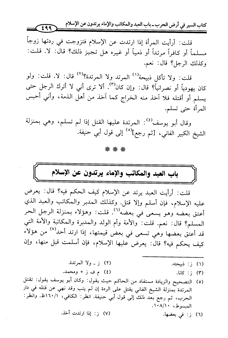 (¬5) التصحيح والزيادة مستفاد من الحاكم حيث يقول: وكان أبو يوسف يقول: تقتل المرتدة بمنزلة الشيخ الفاني يقتل على الردة إن لم يتب وقد نهي عن قتله في دار الحرب، ثم رجع بعد ذلك إلى قول أبي حنيفة. انظر: الكافي، 1/ 160 ظ. وانظر: المبسوط، 10/ 108.