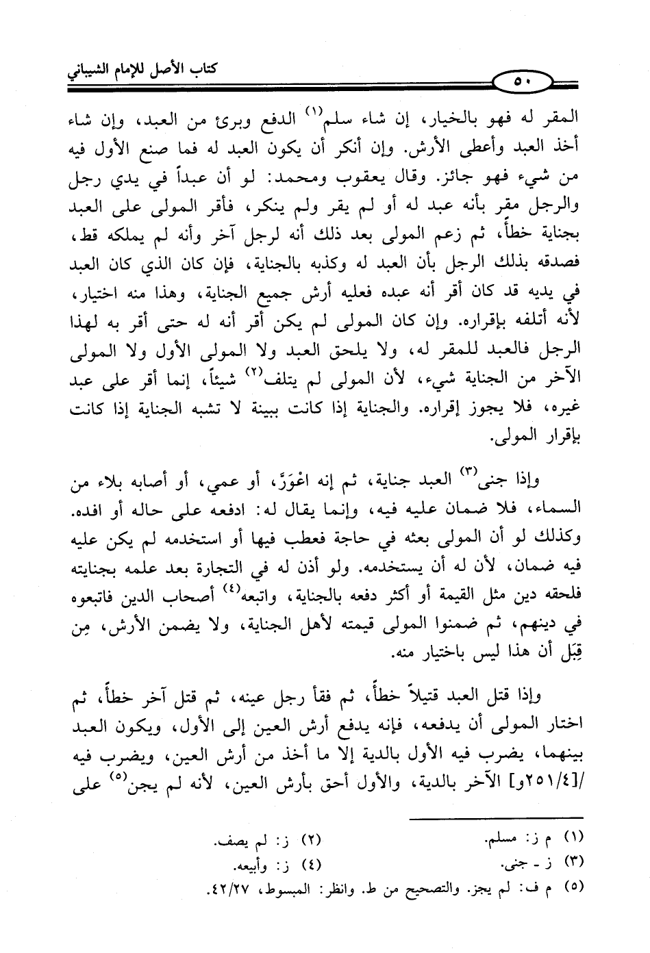 المقر له فهو بالخيار، إن شاء سلم (¬1) الدفع وبرئ من العبد، وإن شاء أخذ العبد وأعطى الأرش. وإن أنكر أن يكون العبد له فما صنع الأول فيه من شيء فهو جائز. وقال يعقوب ومحمد: لو أن عبداً في يدي رجل والرجل مقر بأنه عبد له أو لم يقر ولم ينكر، فأقر المولى على العبد بجناية خطأَ، ثم زعم المولى بعد ذلك أنه لرجل آخر وأنه لم يملكه قط، فصدقه بذلك الرجل بأن العبد له وكذبه بالجناية، فإن كان الذي كان العبد في يديه قد كان أقر أنه عبده فعليه أرش جميع الجناية، وهذا منه اختيار، لأنه أتلفه بإقراره. وإن كان المولى لم يكن أقر أنه له حتى أقر به لهذا الرجل فالعبد للمقر له، ولا يلحق العبد ولا المولى الأول ولا المولى الآخر من الجناية شيء، لأن المولى لم يتلف (¬2) شيئاً، إنما أقر على عبد غيره، فلا يجوز إقراره. والجناية إذا كانت ببينة لا تشبه الجناية إذا كانت بإقرار المولى.