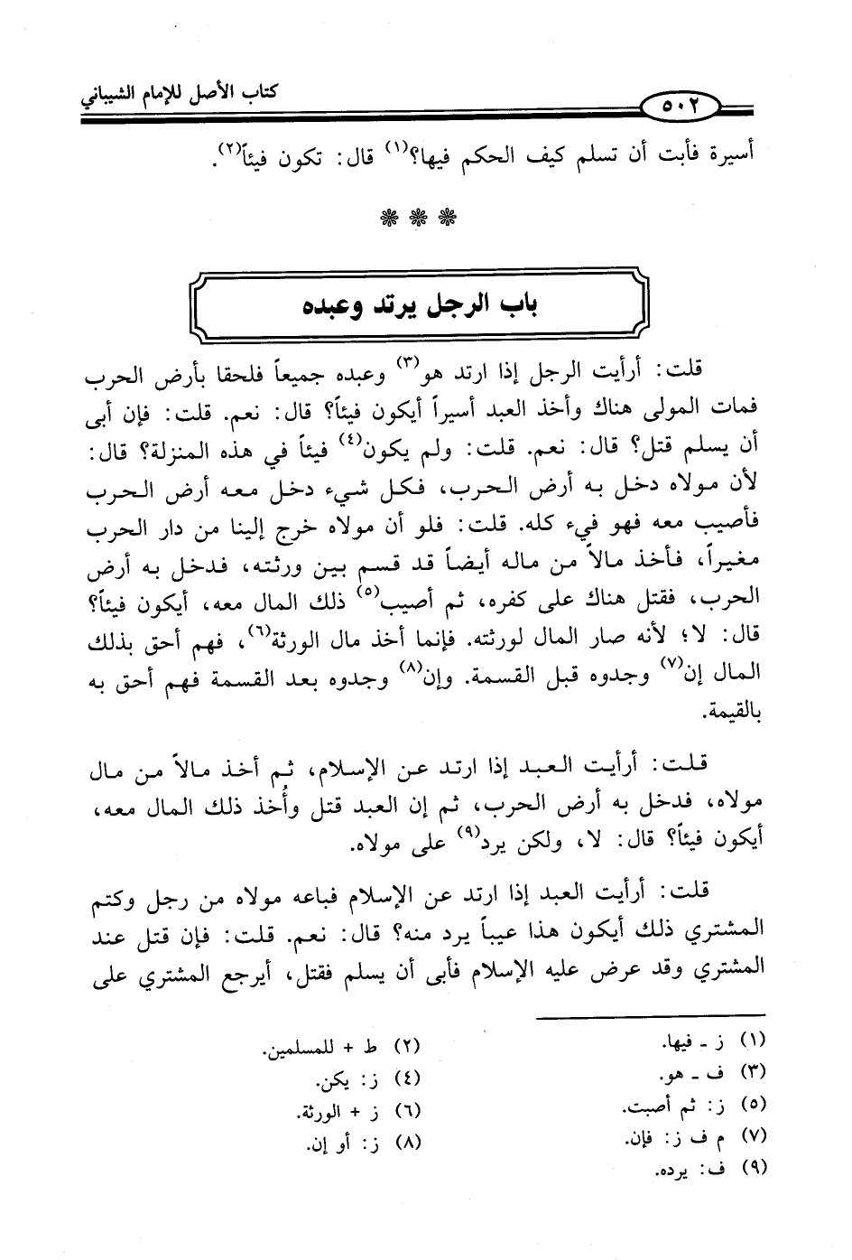 قلت: أرأيت العبد إذا ارتد عن الإسلام، ثم أخذ مالاً من مال مولاه، فدخل به أرض الحرب، ثم إن العبد قتل وأُخذ ذلك المال معه، أيكون فيئاً؟ قال: لا، ولكن يرد (¬9) على مولاه.