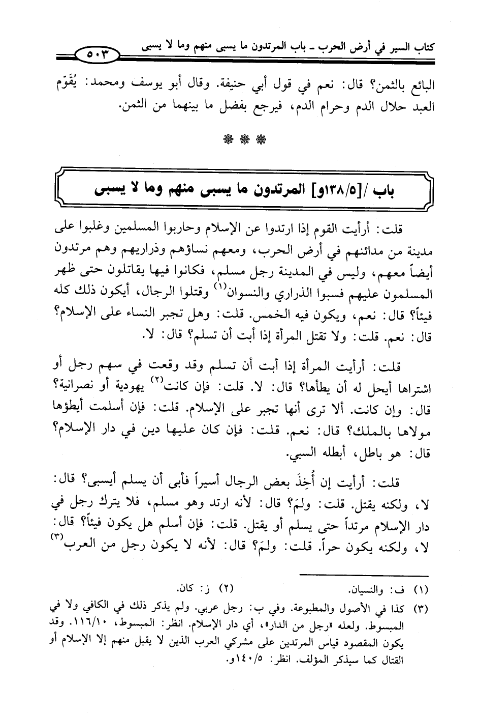 قلت: أرأيت إن أُخِذَ بعض الرجال أسيراً فأبى أن يسلم أيسبى؟ قال: لا، ولكنه يقتل. قلت: ولمَ؟ قال: لأنه ارتد وهو مسلم، فلا يترك رجل في دار الإسلام مرتداً حتى يسلم أو يقتل. قلت: فإن أسلم هل يكون فيئاً؟ قال: لا، ولكنه يكون حراً. قلت: ولمَ؟ قال: لأنه لا يكون رجل من العرب (¬3)