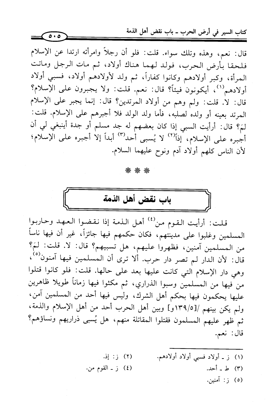 قال: نعم، وهذه وتلك سواء. قلت: فلو أن رجلاً وامرأته ارتدا عن الإسلام فلحقا بأرض الحرب، فولد لهما هناك أولاد، ثم مات الرجل وماتت المرأة، وكبر أولادهم وكانوا كفاراً، ثم ولد لأولادهم أولاد، فسبي أولاد أولادهم (¬1)، أيكونون فيئاً؟ قال: نعم. قلت: ولا يجبرون على الإسلام؟ قال: لا. قلت: ولم وهم من أولاد المرتدين؟ قال: إنما يجبر على الإسلام المرتد بعينه أو ولده لصلبه، فأما ولد الولد فلا أجبرهم على الإسلام. قلت: لمَ؟ قال: أرأيت السبي إذا كان بعضهم له جد مسلم أو جدة أينبغي لي أن أجبره على الإسلام، إذاً (¬2) لا يُسبى أحد (¬3) أبداً إلا أجبره على الإسلام؛ لأن الناس كلهم أولاد آدم ونوح عليهما السلام.