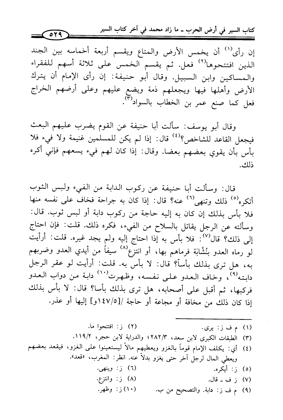 قال: وسألت أبا حنيفة عن ركوب الدابة من الفيء ولبس الثوب أتكره (¬5) ذلك وتنهى (¬6) عنه؟ قال: إذا كان به جراحة فخاف على نفسه منها فلا بأس بذلك إن كان به إليه حاجة من ركوب دابة أو لبس ثوب. قال: وسألته عن الرجل يقاتل بالسلاح من الفيء، فكره ذلك. قلت: فإن احتاج إلى ذلك؟ قال (¬7): فلا بأس به إذا احتاج إليه ولم يجد غيره. قلت: أرأيت لو رماه العدو بنُشّابَة فرماهم بها، أو انتزع (¬8) سيفاً من أيدي العدو وضربهم به، هل ترى بذلك بأساً؟ قال: لا بأس به. قلت: أرأيت لو عقر الرجل دابته (¬9)، وخاف العدو على نفسه، وظهرت (¬10) دابة من دواب العدو فركبها، ثم أقبل على أصحابه، هل ترى بذلك بأسا؟ قال: لا بأس بذلك إذا كان ذلك من مخافة أو مجاعة أو حاجة إليها أو عذر.