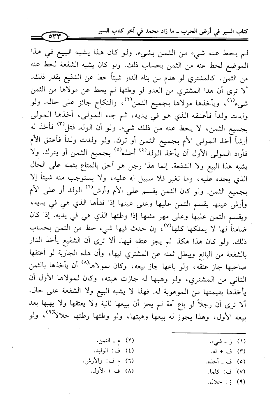 لم يحط عنه شيء من الثمن بشيء. ولو كان هذا يشبه البيع في هذا الموضع لحط عنه من الثمن بحساب ذلك. ولو كان يشبه الشفعة لحط عنه من الثمن، كالمشتري لو هدم من بناء الدار شيئاً حط عن الشفيع بقدر ذلك. ألا ترى أن هذا المشتري من العدو لو وطئها لم يحط عن مولاها من الثمن شيء (¬1)، ويأخذها مولاها بجميع الثمن (¬2)، والنكاح جائز على حاله. ولو ولدت ولداً فأعتقه الذي هو في يديه، ثم جاء المولى، أخذها المولى بجميع الثمن، لا يحط عنه من ذلك شيء. ولو أن الولد قتل (¬3) فأخذ له أرشًا أخذ المولى الأم بجميع الثمن أو ترك. ولو ولدت ولداً فأعتق الأم فأراد المولى الأول أن يأخذ الولد (¬4) أخذه (¬5) بجميع الثمن أو يترك. ولا يشبه هذا البيع ولا الشفعة. إنما هذا رجل هو أحق بالمتاع بثمنه على الحال الذي يجده عليه، وما تغير فلا سبيل له عليه، ولا يستوجب منه شيئاً إلا بجميع الثمن. ولو كان الثمن يقسم على الأم وأرش (¬6) الولد أو على الأم وأرش عينها يقسم الثمن عليها وعلى عينها إذا فقأها الذي هي في يديه، ويقسم الثمن عليها وعلى مهر مثلها إذا وطئها الذي هي في يديه. إذا كان ضامناً لها لا يملكها كلها (¬7)، إن حدث فيها شيء حط من الثمن بحساب ذلك. ولو كان هذا هكذا لم يجز عتقه فيها. ألا ترى أن الشفيع يأخذ الدار بالشفعة من البائع ويبطل ثمنه عن المشتري فيها، وأن هذه الجارية لو أعتقها صاحبها جاز عتقه، ولو باعها جاز بيعه، وكان لمولاها (¬8) أن يأخذها بالثمن الثاني من المشتري، ولو وهبها له جازت هبته، وكان لمولاها الأول أن يأخذها بقيمتها من الموهوبة له. فهذا لا يشبه البيع ولا الشفعة على حال. ألا ترى أن رجلاً لو باع أمة لم يجز أن يبيعها ثانية ولا يعتقها ولا يهبها بعد بيعه الأول، وهذا يجوز له بيعها وهبتها، ولو وطئها وطئها حلالاً (¬9)، ولو