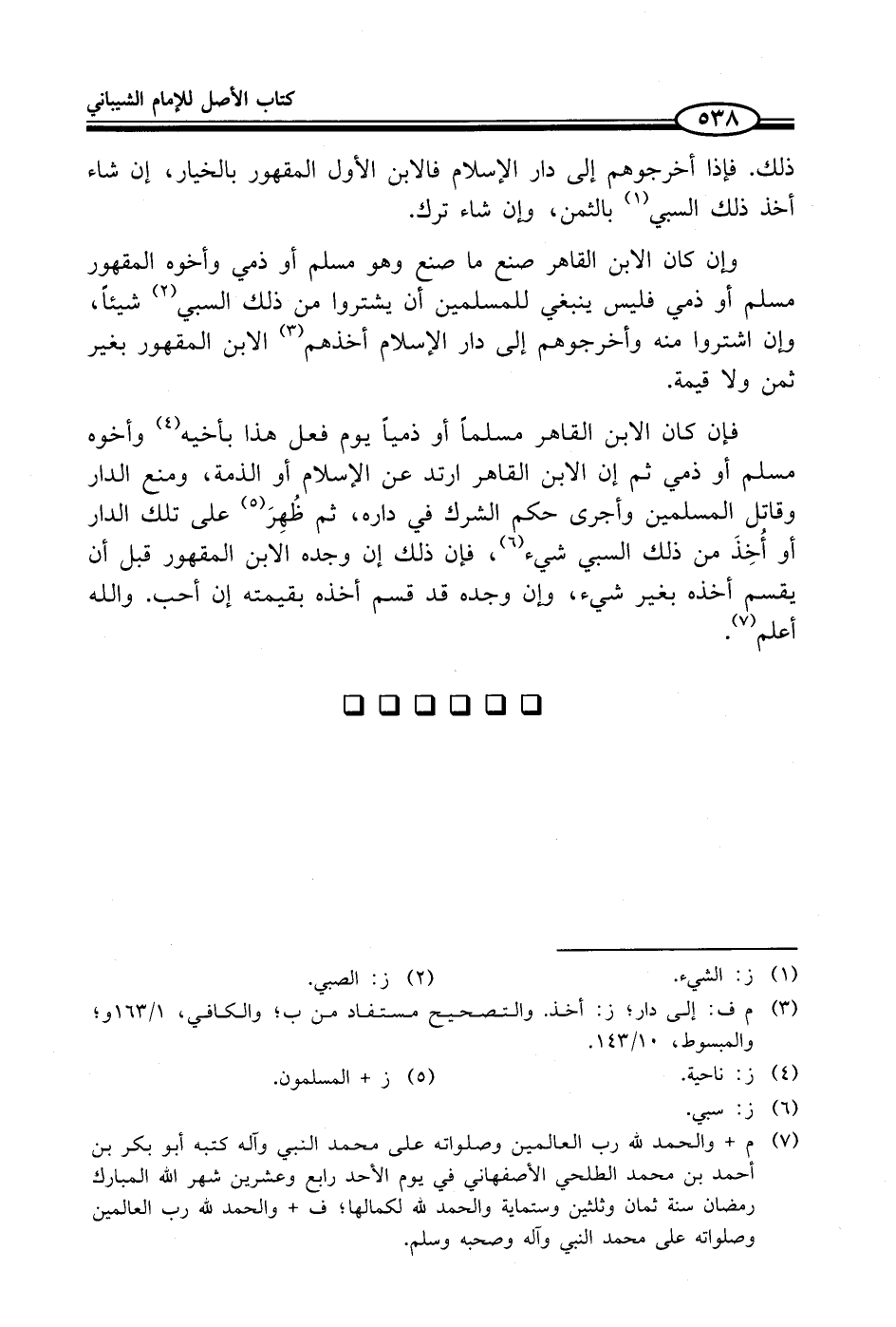 فإن كان الابن القاهر مسلماً أو ذمياً يوم فعل هذا بأخيه (¬4) وأخوه مسلم أو ذمي ثم إن الابن القاهر ارتد عن الإسلام أو الذمة، ومنع الدار وقاتل المسلمين وأجرى حكم الشرك في داره، ثم ظُهِرَ (¬5) على تلك الدار أو أُخِذَ من ذلك السبي شيء (¬6)، فإن ذلك إن وجده الابن المقهور قبل أن يقسم أخذه بغير شيء، وإن وجده قد قسم أخذه بقيمته إن أحب. والله أعلم (¬7).