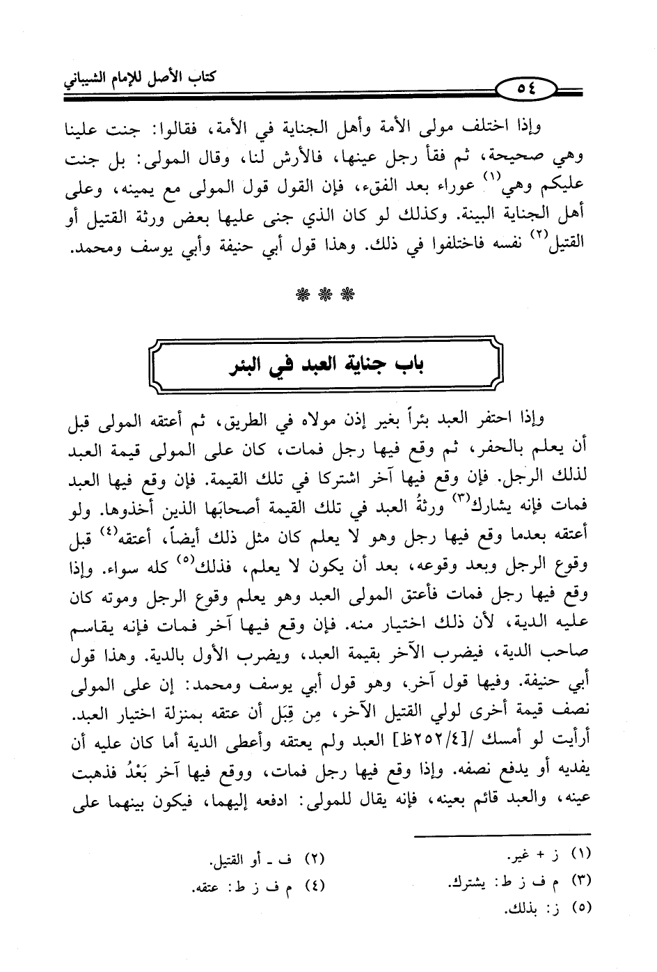 وإذا احتفر العبد بئراً بغير إذن مولاه في الطريق، ثم أعتقه المولى قبل أن يعلم بالحفر، ثم وقع فيها رجل فمات، كان على المولى قيمة العبد لذلك الرجل. فإن وقع فيها آخر اشتركا في تلك القيمة. فإن وقع فيها العبد فمات فإنه يشارك (¬3) ورثةُ العبد في تلك القيمة أصحابَها الذين أخذوها. ولو أعتقه بعدما وقع فيها رجل وهو لا يعلم كان مثل ذلك أيضاً، أعتقه (¬4) قبل وقوع الرجل وبعد وقوعه، بعد أن يكون لا يعلم، فذلك (¬5) كله سواء. وإذا وقع فيها رجل فمات فأعتق المولى العبد وهو يعلم وقوع الرجل وموته كان عليه الدية، لأن ذلك اختيار منه. فإن وقع فيها آخر فمات فإنه يقاسم صاحب الدية، فيضرب الآخر بقيمة العبد، ويضرب الأول بالدية. وهذا قول أبي حنيفة. وفيها قول آخر، وهو قول أبي يوسف ومحمد: إن على المولى نصف قيمة أخرى لولي القتيل الآخر، مِن قِبَل أن عتقه بمنزلة اختيار العبد. أرأيت لو أمسك العبد ولم يعتقه وأعطى الدية أما كان عليه أن يفديه أو يدفع نصفه. وإذا وقع فيها رجل فمات، ووقع فيها آخر بَعْدُ فذهبت عينه، والعبد قائم بعينه، فإنه يقال للمولى: ادفعه إليهما، فيكون بينهما على