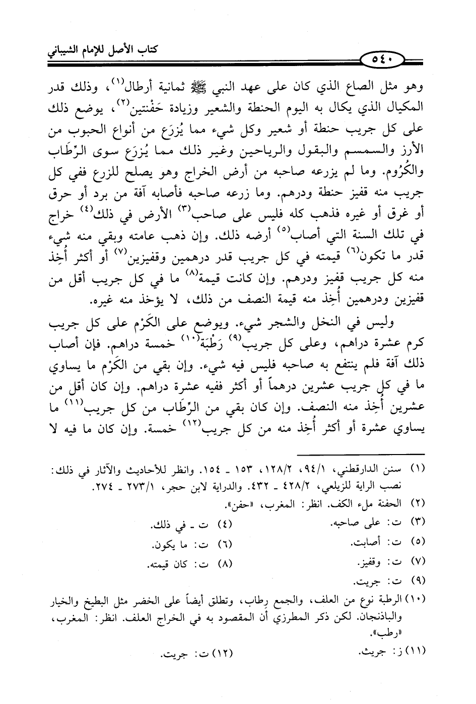 وهو مثل الصالح الذي كان على عهد النبي - صلى الله عليه وسلم - ثمانية أرطال (¬1)، وذلك قدر المكيال الذي يكال به اليوم الحنطة والشعير وزيادة حَفْنتين (¬2)، يوضع ذلك على كل جريب حنطة أو شعير وكل شيء مما يُزرَع من أنواع الحبوب من الأرز والسمسم والبقول والرياحين وغير ذلك مما يُزرَع سوى الرَّطاب والكُرُوم. وما لم يزرعه صاحبه من أرض الخراج وهو يصلح للزرع ففي كل جريب منه قفيز حنطة ودرهم. وما زرعه صاحبه فأصابه آفة من برد أو حرق أو غرق أو غيره فذهب كله فليس على صاحب (¬3) الأرض في ذلك (¬4) خراج في تلك السنة التي أصاب (¬5) أرضه ذلك. وإن ذهب عامته وبقي منه شيء قدر ما تكون (¬6) قيمته في كل جريب قدر درهمين وقفيزين (¬7) أو أكثر أُخِذ منه كل جريب قفيز ودرهم. وإن كانت قيمة (¬8) ما في كل جريب أقل من قفيزين ودرهمين أُخِذ منه قيمة النصف من ذلك، لا يؤخذ منه غيره.