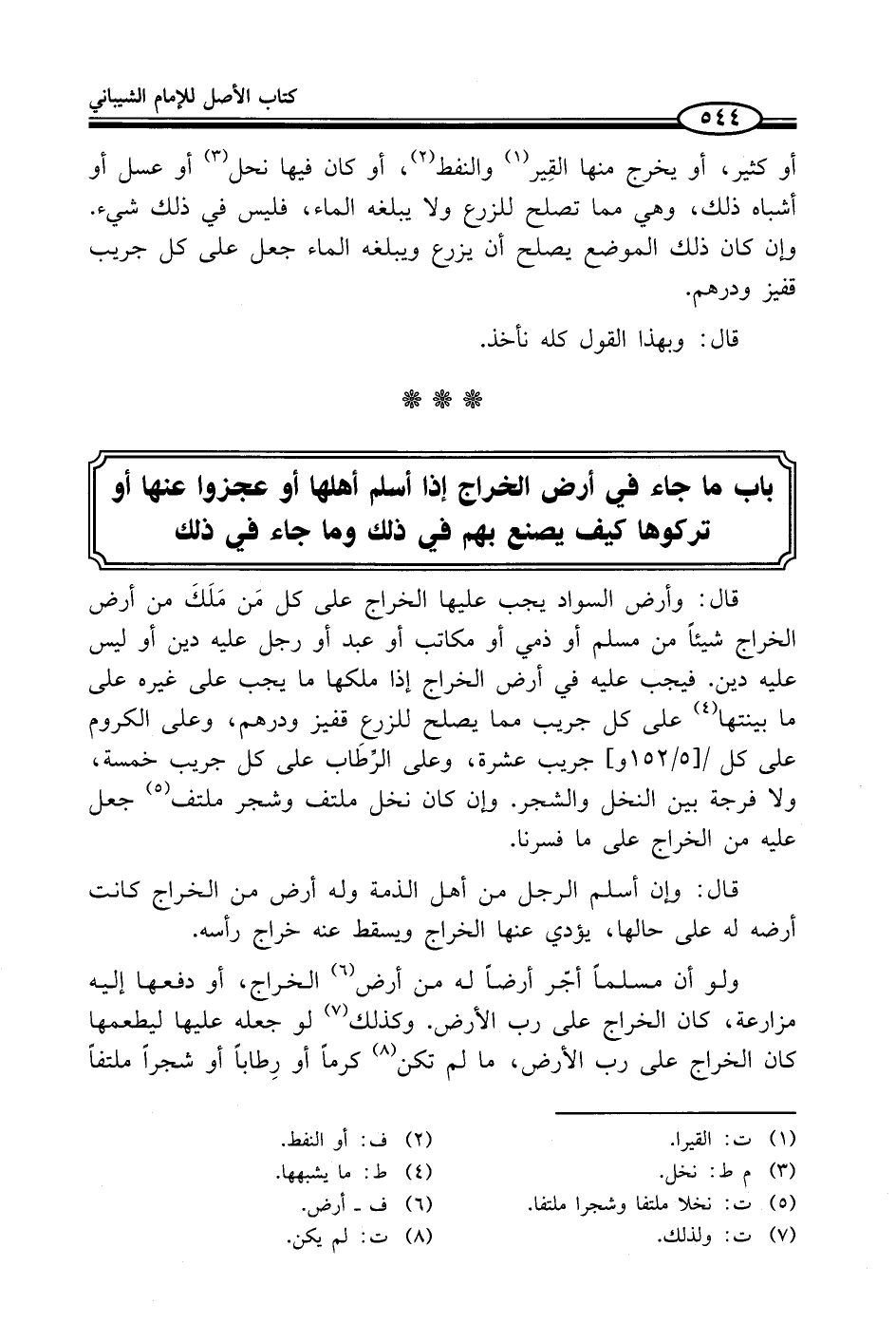 قال: وأرض السواد يجب عليها الخراج على كل مَن مَلَكَ من أرض الخراج شيئاً من مسلم أو ذمي أو مكاتب أو عبد أو رجل عليه دين أو ليس عليه دين. فيجب عليه في أرض الخراج إذا ملكها ما يجب على غيره على ما بينتها (¬4) على كل جريب مما يصلح للزرع قفيز ودرهم، وعلى الكروم على كل جريب عشرة، وعلى الرِّطَاب على كل جريب خمسة، ولا فرجة بين النخل والشجر. وإن كان نخل ملتف وشجر ملتف (¬5) جعل عليه من الخراج على ما فسرنا.