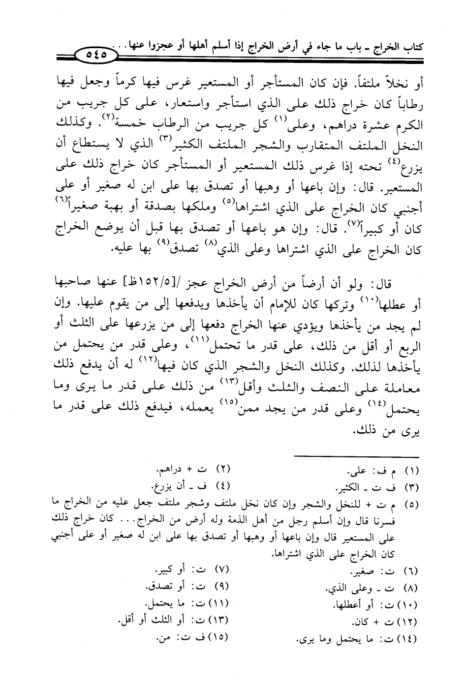 أو نخلاً ملتفاً. فإن كان المستأجر أو المستعير غرس فيها كرماً وجعل فيها رطابًا كان خراج ذلك على الذي استأجر واستعار، على كل جريب من الكرم عشرة دراهم، وعلى (¬1) كل جريب من الرطاب خمسة (¬2). وكذلك النخل الملتف المتقارب والشجر الملتف الكثير (¬3) الذي لا يستطاع أن يزرع (¬4) تحته إذا غرس ذلك المستعير أو المستأجر كان خراج ذلك على المستعير. قال: وإن باعها أو وهبها أو تصدق بها على ابن له صغير أو على أجنبي كان الخراج على الذي اشتراها (¬5) وملكها بصدقة أو بهبة صغيراً (¬6) كان أو كبيراً (¬7). قال: وإن هو باعها أو تصدق بها قبل أن يوضع الخراج كان الخراج على الذي اشتراها وعلى الذي (¬8) تصدق (¬9) بها عليه.