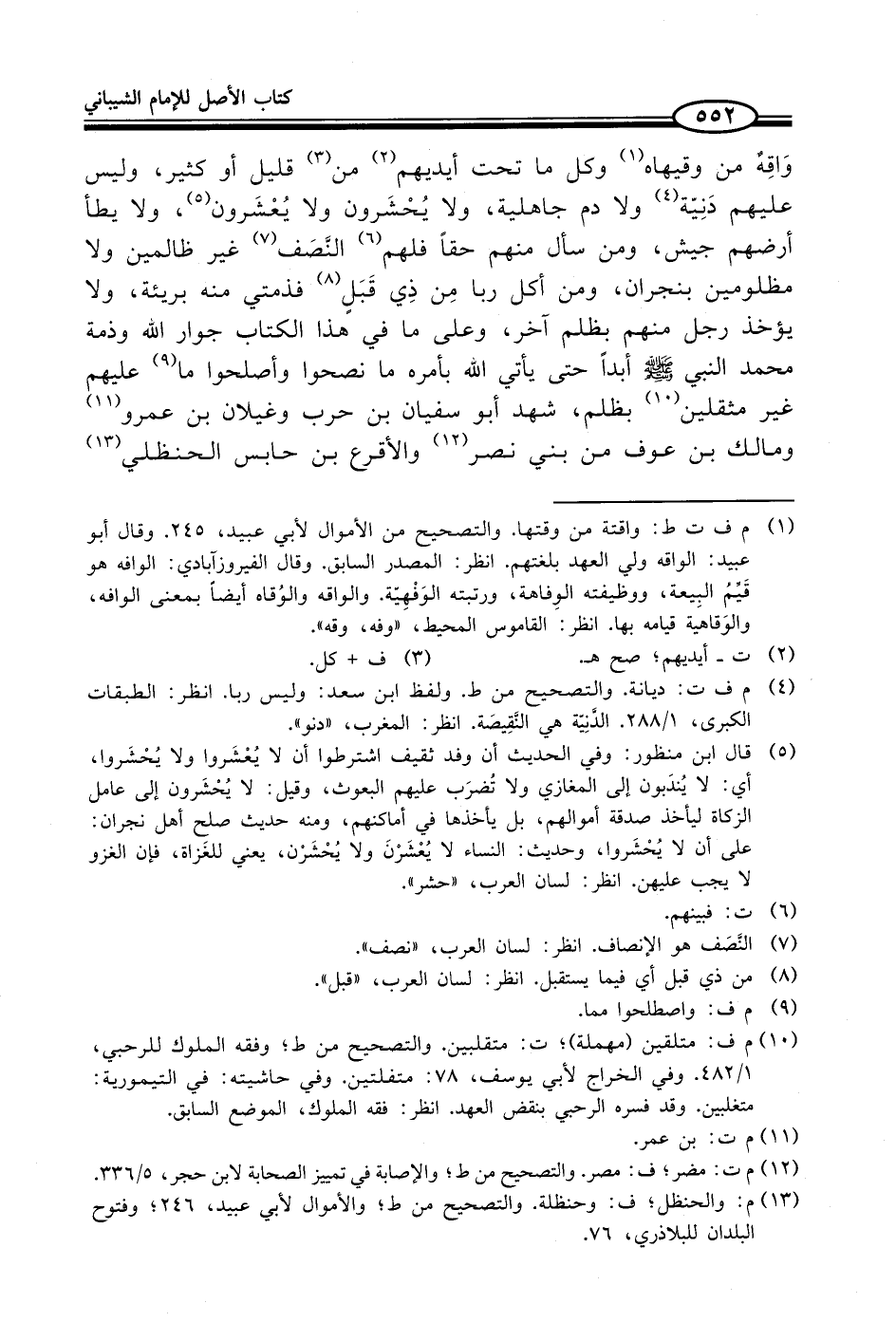 واقِهٌ من وقيهاه (¬1) وكل ما تحت أيديهم (¬2) من (¬3) قليل أو كثير، وليس عليهم دَنِيّة (¬4) ولا دم جاهلية، ولا يُحْشَرون ولا يُعْشَرون (¬5)، ولا يطأ أرضهم جيش، ومن سأل منهم حقاً فلهم (¬6) النَّصَف (¬7) غير ظالمين ولا مظلومين بنجران، ومن أكل ربا مِن ذِي قَبَل (¬8) فذمتي منه بريئة، ولا يؤخذ رجل منهم بظلم آخر، وعلى ما في هذا الكتاب جوار الله وذمة محمد النبي - صلى الله عليه وسلم - أبداً حتى يأتي الله بأمره ما نصحوا وأصلحوا ما (¬9) عليهم غير مثقلين (¬10) بظلم، شهد أبو سفيان بن حرب وغيلان بن عمرو (¬11) ومالك بن عوف من بني نصر (¬12) والأقرع بن حابس الحنظلي (¬13)