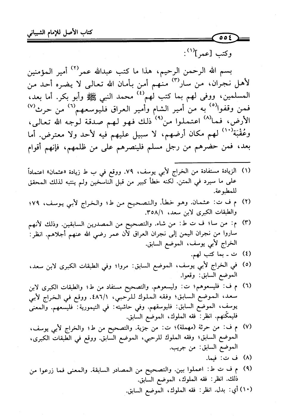 (¬1) الزيادة مستفادة من الخراج لأبي يوسف، 79. ووقع في ب ط زيادة "عثمان" اعتماداً على ما سيرد في المتن. لكنه خطأ كبير من قبل الناسخين ولم ينتبه لذلك المحقق للمطبوعة.