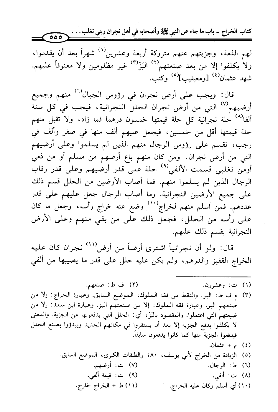 قال: ويجب على أرض نجران في رؤوس الجبال (¬6) منهم وجميع أرضيهم (¬7) التي من أرض نجران الحلل النجرانية، فيجب في كل سنة ألفا (¬8) حلة نجرانية كل حلة قيمتها خمسون درهما فما زاد، ولا تقبل منهم حلة قيمتها أقل من خمسين، فيجعل عليهم ألف منها في صفر وألف في رجب، تقسم على رؤوس الرجال منهم الذين لم يسلموا وعلى أرضيهم التي من أرض نجران. ومن كان منهم باع أرضهم من مسلم أو من ذمي أو من تغلبي قسمت الألفي (¬9) حلة على قدر أرضيهم وعلى قدر رقاب الرجال الذين لم يسلموا منهم. فما أصاب الأرضين من الحلل قسم ذلك على جميع الأرضين النجرانية. وما أصاب الرجال جعل عليهم على قدر عددهم. فمن أسلم منهم لخراج (¬10) وضع عنه خراج رأسه، وجعل ما كان على رأسه من الحلل، فجعل ذلك على من بقي منهم وعلى الأرض النجرانية يقسم ذلك عليهم.