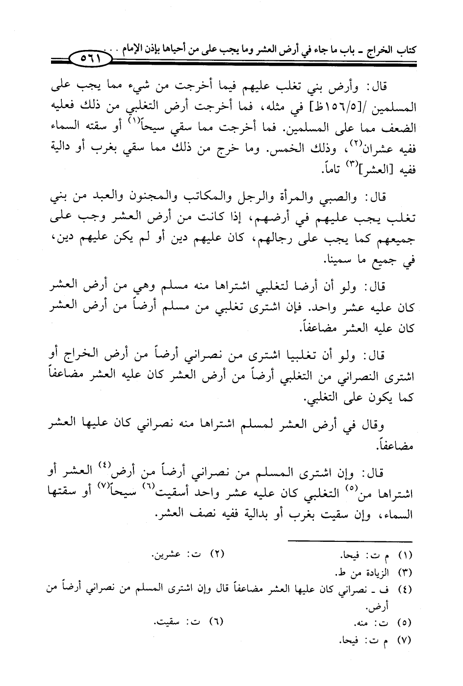قال: وأرض بني تغلب عليهم فيما أخرجت من شيء مما يجب على المسلمين في مثله، فما أخرجت أرض التغلبي من ذلك فعليه الضعف مما على المسلمين. فما أخرجت مما سقي سيحاً (¬1) أو سقته السماء ففيه عشران (¬2)، وذلك الخمس. وما خرج من ذلك مما سقي بغرب أو دالية ففيه [العشر] (¬3) تاماً.