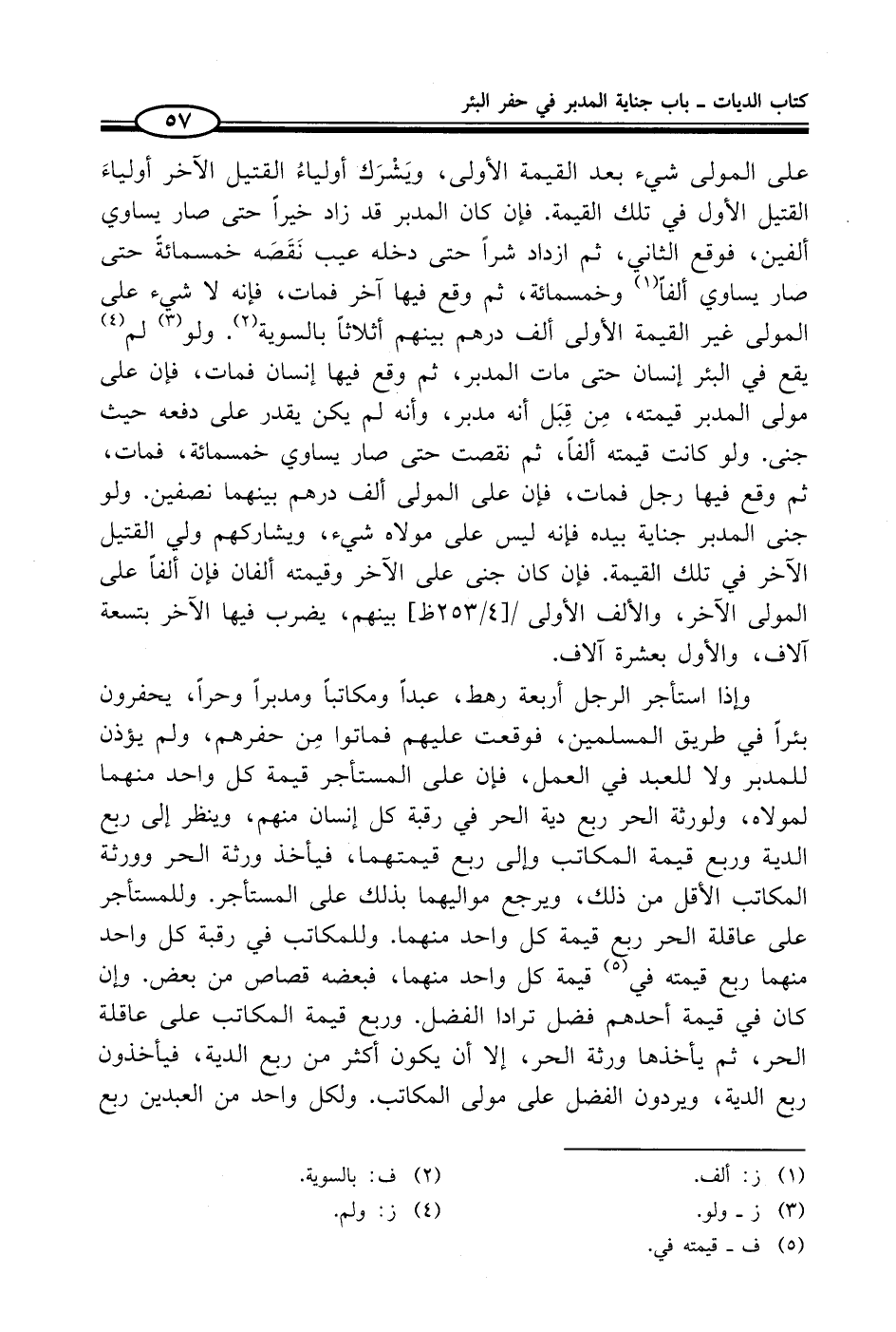 وإذا استأجر الرجل أربعة رهط، عبداً ومكاتباً ومدبراً وحراً، يحفرون بئراً في طريق المسلمين، فوقعت عليهم فماتوا مِن حفرهم، ولم يؤذن للمدبر ولا للعبد في العمل، فإن على المستأجر قيمة كل واحد منهما لمولاه، ولورثة الحر ربع دية الحر في رقبة كل إنسان منهم، وينظر إلى ربع الدية وربع قيمة المكاتب وإلى ربع قيمتهما، فيأخذ ورثة الحر وورثة المكاتب الأقل من ذلك، ويرجع مواليهما بذلك على المستأجر. وللمستأجر على عاقلة الحر ربع قيمة كل واحد منهما. وللمكاتب في رقبة كل واحد منهما ربع قيمته في (¬5) قيمة كل واحد منهما، فبعضه قصاص من بعض. وإن كان في قيمة أحدهم فضل ترادا الفضل. وربع قيمة المكاتب على عاقلة الحر، ثم يأخذها ورثة الحر، إلا أن يكون أكثر من ربع الدية، فيأخذون ربع الدية، ويردون الفضل على مولى المكاتب. ولكل واحد من العبدين ربع