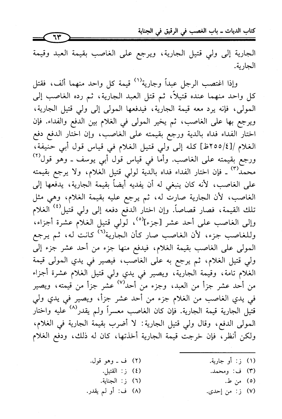 وإذا اغتصب الرجل عبداً وجارية (¬1) قيمة كل واحد منهما ألف، فقتل كل واحد منهما عنده قتيلاً، ثم قتل العبد الجارية، ثم رده الغاصب إلى المولى، فإنه يرد معه قيمة الجارية، فيدفعها المولى إلى ولي قتيل الجارية، ويرجع بها على الغاصب، ثم يخير المولى في الغلام بين الدفع والفداء. فإن اختار الفداء فداه بالدية ورجع بقيمته على الغاصب، وإن اختار الدفع دفع الغلام كله إلى ولي قتيل الغلام في قياس قول أبي حنيفة، ورجع بقيمته على الغاصب. وأما في قياس قول أبي يوسف - وهو قول (¬2) محمد (¬3) - فإن اختار الفداء فداه بالدية لولي قتيل الغلام، ولا يرجع بقيمته على الغاصب، لأنه كان ينبغي له أن يفديه أيضاً بقيمة الجارية، يدفعها إلى الغاصب، لأن الجارية صارت له، ثم يرجع عليه بقيمة الغلام، وهي مثل تلك القيمة، فصار قصاصاً. وإن اختار الدفع دفعه إلى ولي قتيل (¬4) الغلام وإلى الغاصب على أحد عشر [جزء] (¬5)، لولي قتيل الغلام عشرة أجزاء، وللغاصب جزء، لأن الغاصب صار كأن الجارية (¬6) كانت له، ثم يرجع المولى على الغاصب بقيمة الغلام، فيدفع منها جزء من أحد عشر جزء إلى ولي قتيل الغلام، ثم يرجع به على الغاصب، فيصير في يدي المولى قيمة الغلام تامة، وقيمة الجارية، ويصير في يدي ولي قتيل الغلام عشرة أجزاء من أحد عشر جزأ من العبد، وجزء من أحد (¬7) عشر جزأ من قيمته، ويصير في يدي الغاصب من الغلام جزء من أحد عشر جزأ، ويصير في يدي ولي قتيل الجارية قيمة الجارية. فإن كان الغاصب معسراً ولم يقدر (¬8) عليه واختار المولى الدفع، وقال ولي قتيل الجارية: لا أضرب بقيمة الجارية في الغلام، ولكن أنظر، فإن خرجت قيمة الجارية أخذتها، كان له ذلك، ودفع الغلام