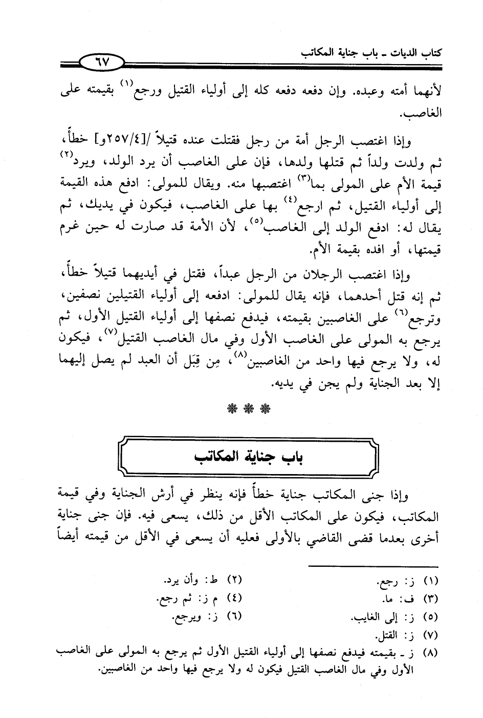 (¬8) ز - بقيمته فيدفع نصفها إلى أولياء القتيل الأول ثم يرجع به المولى على الغاصب الأول وفي مال الغاصب القتيل فيكون له ولا يرجع فيها واحد من الغاصبين.