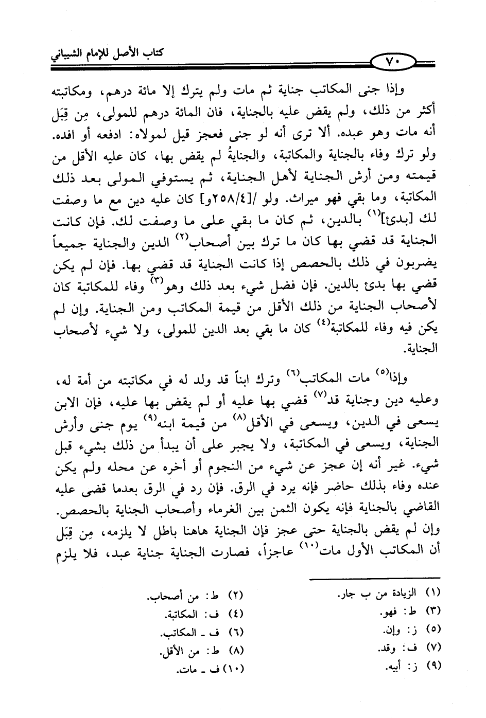 وإذا جنى المكاتب جناية ثم مات ولم يترك إلا مائة درهم، ومكاتبته أكثر من ذلك، ولم يقض عليه بالجناية، فإن المائة درهم للمولى، مِن قِبَل أنه مات وهو عبده. ألا ترى أنه لو جنى فعجز قيل لمولاه: ادفعه أو افده. ولو ترك وفاء بالجناية والمكاتبة، والجنايةُ لم يقض بها، كان عليه الأقل من قيمته ومن أرش الجناية لأهل الجناية، ثم يستوفي المولى بعد ذلك المكاتبة، وما بقي فهو ميراث. ولو كان عليه دين مع ما وصفت لك [بدئ] (¬1) بالدين، ثم كان ما بقي على ما وصفت لك. فإن كانت الجناية قد قضي بها كان ما ترك بين أصحاب (¬2) الدين والجناية جميعاً يضربون في ذلك بالحصص إذا كانت الجناية قد قضي بها. فإن لم يكن قضي بها بدئ بالدين. فإن فضل شيء بعد ذلك وهو (¬3) وفاء للمكاتبة كان لأصحاب الجناية من ذلك الأقل من قيمة المكاتب ومن الجناية. وإن لم يكن فيه وفاء للمكاتبة (¬4) كان ما بقي بعد الدين للمولى، ولا شيء لأصحاب الجناية.