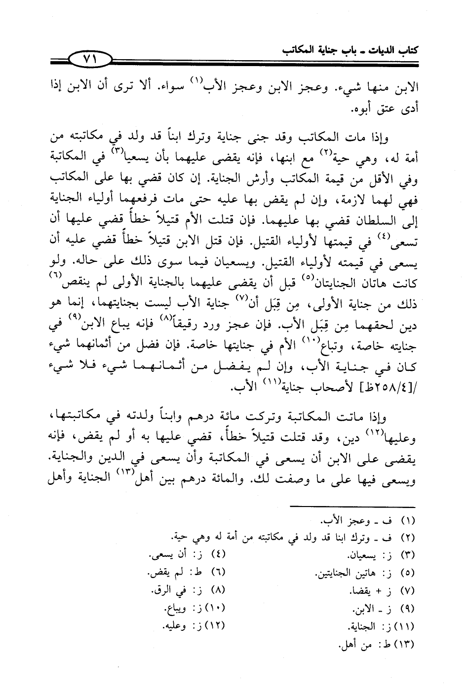 وإذا ماتت المكاتبة وتركت مائة درهم وابناً ولدته في مكاتبتها، وعليها (¬12) دين، وقد قتلت قتيلاً خطأً، قضي عليها به أو لم يقض، فإنه يقضى على الابن أن يسعى في المكاتبة وأن يسعى في الدين والجناية. ويسعى فيها على ما وصفت لك. والمائة درهم بين أهل (¬13) الجناية وأهل