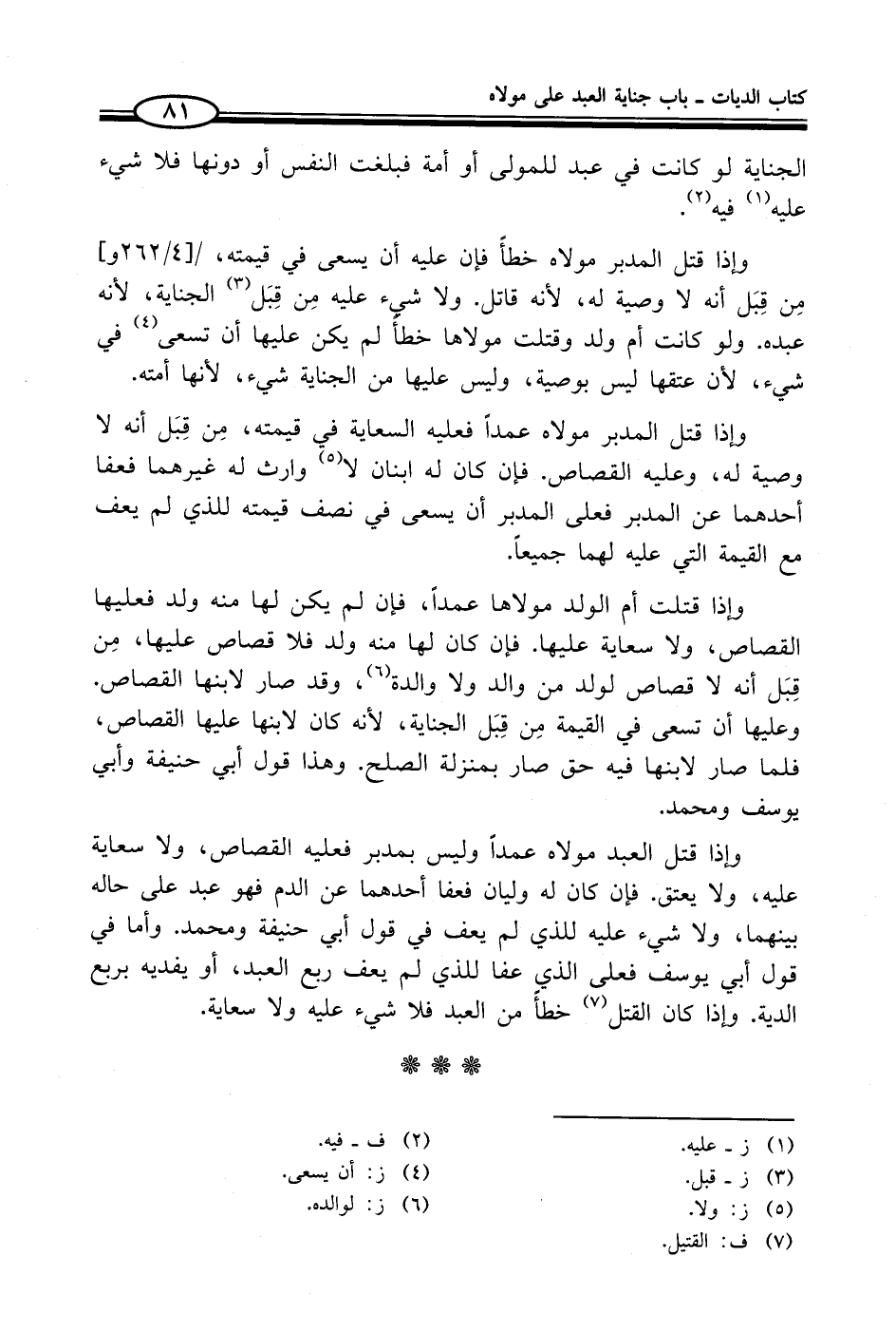 وإذا قتل المدبر مولاه خطأً فإن عليه أن يسعى في قيمته، مِن قِبَل أنه لا وصية له، لأنه قاتل. ولا شيء عليه مِن قِبَل (¬3) الجناية، لأنه عبده. ولو كانت أم ولد وقتلت مولاها خطأ لم يكن عليها أن تسعى (¬4) في شيء، لأن عتقها ليس بوصية، وليس عليها من الجناية شيء، لأنها أمته.