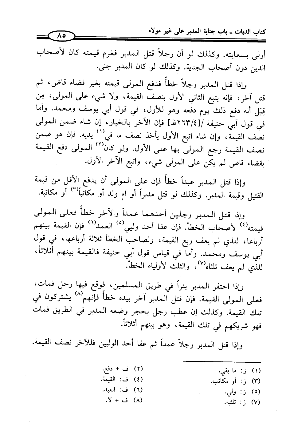 وإذا احتفر المدبر بئراً في طريق المسلمين، فوقع فيها رجل فمات، فعلى المولى القيمة. فإن قتل المدبر آخر بيده خطأً فإنهم (¬8) يشتركون في تلك القيمة. وكذلك إن عطب رجل بحجر وضعه المدبر في الطريق فمات فهو شريكهم في تلك القيمة، وهو بينهم أثلاثاً.