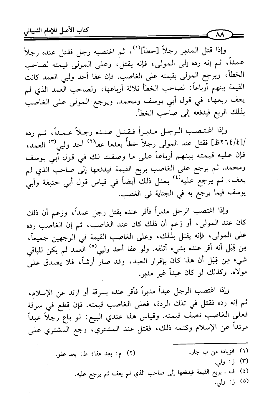وإذا اغتصب الرجل مدبراً فقتل عنده رجلاً عمداً، ثم رده فقتل عند المولى رجلاً خطأً بعدما عفا (¬2) أحد وليي (¬3) العمد، فإن عليه قيمته بينهم أرباعأ على ما وصفت لك في قول أبي يوسف ومحمد. ثم يرجع على الغاصب بربع القيمة فيدفعها إلى صاحب الذي لم يعف، ثم يرجع عليه (¬4) بمثل ذلك أيضاً في قياس قول أبي حنيفة وأبي يوسف فيما يرجع به في الجناية في الغصب.
