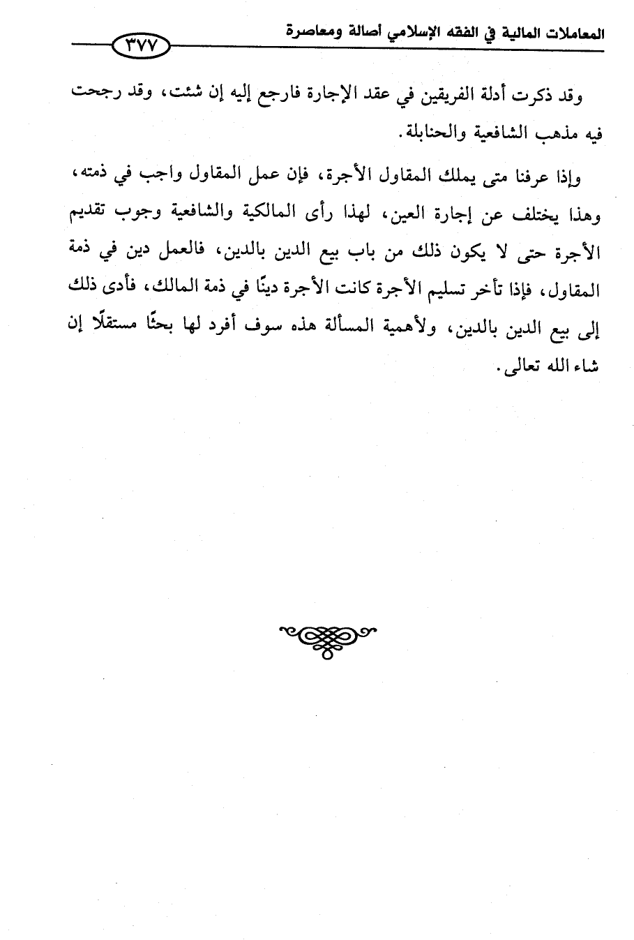 وإذا عرفنا متى يملك المقاول الأجرة، فإن عمل المقاول واجب في ذمته، وهذا يختلف عن إجارة العين، لهذا رأى المالكية والشافعية وجوب تقديم الأجرة حتى لا يكون ذلك من باب بيع الدين بالدين، فالعمل دين في ذمة المقاول، فإذا تأخر تسليم الأجرة كانت الأجرة دينًا في ذمة المالك، فأدى ذلك إلى بيع الدين بالدين، ولأهمية المسألة هذه سوف أفرد لها بحثًا مستقلًا إن شاء الله تعالى.
