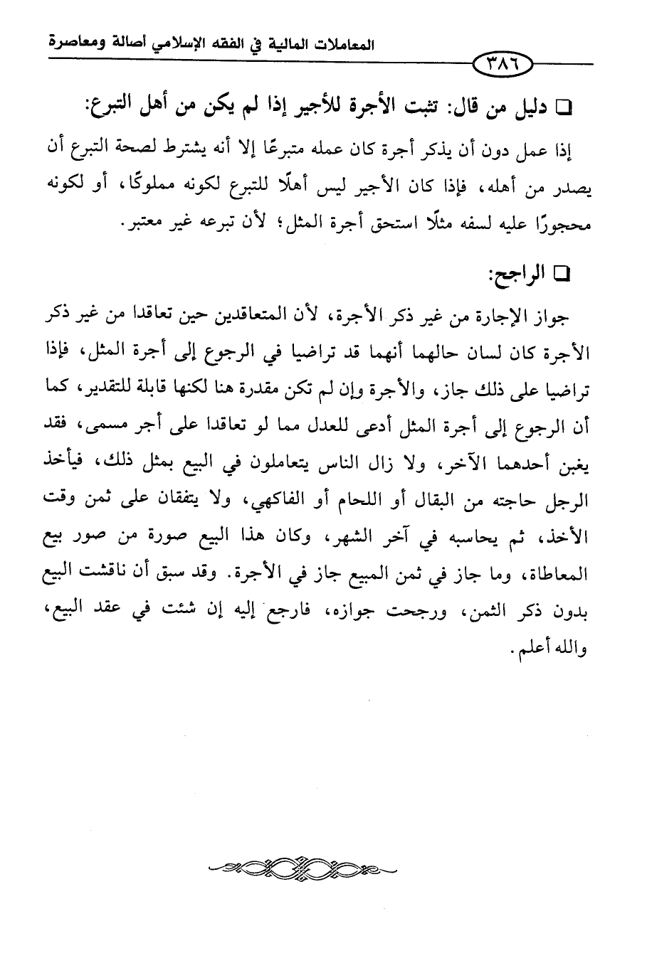 جواز الإجارة من غير ذكر الأجرة؛ لأن المتعاقدين حين تعاقدا من غير ذكر الأجرة كان لسان حالهما أنهما قد تراضيا في الرجوع إلى أجرة المثل، فإذا تراضيا على ذلك جاز، والأجرة وإن لم تكن مقدرة هنا لكنها قابلة للتقدير، كما أن الرجوع إلى أجرة المثل أدعى للعدل مما لو تعاقدا على أجر مسمى، فقد يغبن أحدهما الآخر، ولا زال الناس يتعاملون في البيع بمثل ذلك، فيأخذ الرجل حاجته من البقال أو اللحام أو الفاكهي، ولا يتفقان على ثمن وقت الأخذ، ثم يحاسبه في آخر الشهر، وكان هذا البيع صورة من صور بيع المعاطاة، وما جاز في ثمن المبيع جاز في الأجرة. وقد سبق أن ناقشت البيع بدون ذكر الثمن، ورجحت جوازه، فارجع إليه إن شئت في عقد البيع، والله أعلم.
