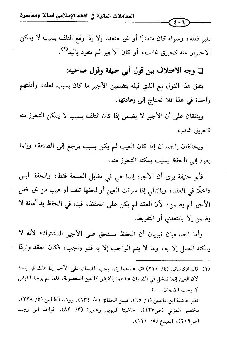 فأبو حنيفة يرى أن الأجرة إنما هي في مقابل الصنعة فقط، والحفظ ليس داخلًا في العقد، وبالتالي إذا سرقت العين أو لحقها تلف أو عيب من غير فعل الأجير لم يضمن؛ لأن العقد لم يكن على الحفظ، فيده في الحفظ يد أمانة لا يضمن إلا بالتعدي أو التفريط.