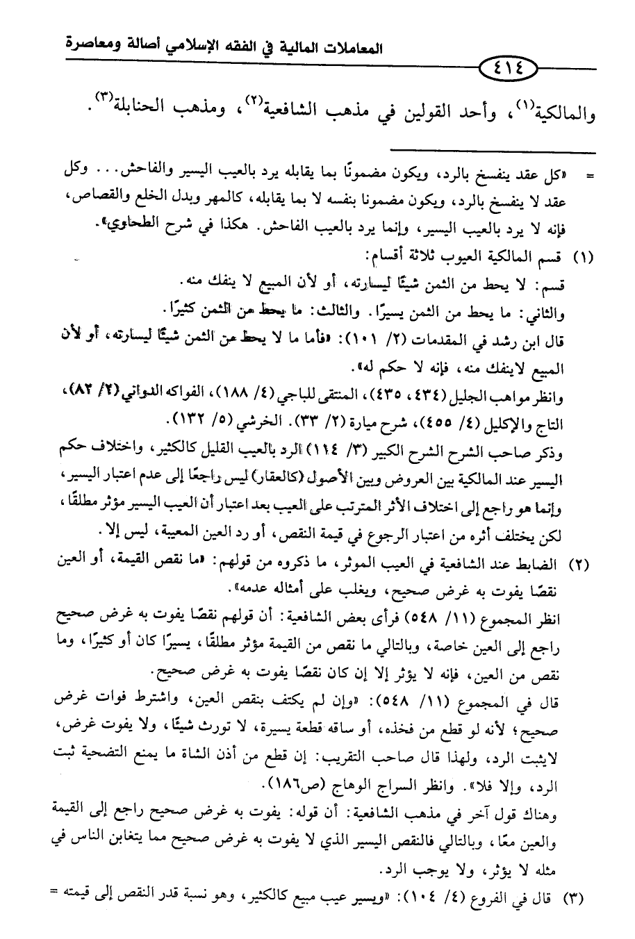 وذكر صاحب الشرح الشرح الكبير (٣/ ١١٤) الرد بالعيب القليل كالكثير، واختلاف حكم اليسير عند المالكية بين العروض وبين الأصول (كالعقار) ليس راجعاً إلى عدم اعتبار اليسير، وإنما هو راجع إلى اختلاف الأثر المترتب على العيب بعد اعتيار أن العيب اليسير مؤثر مطلقاً، لكن يختلف أثره من اعتبار الرجوع في قيمة النقص، أو رد العين المعيبة، ليس إلا.