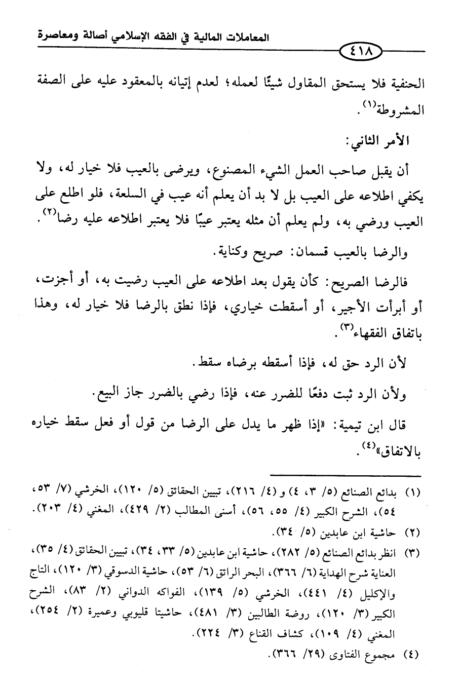 أن يقبل صاحب العمل الشيء المصنوع، ويرضى بالعيب فلا خيار له، ولا يكفي اطلاعه على العيب بل لا بد أن يعلم أنه عيب في السلعة، فلو اطلع على العيب ورضي به، ولم يعلم أن مثله يعتبر عيباً فلا يعتبر اطلاعه عليه رضا (¬٢).
