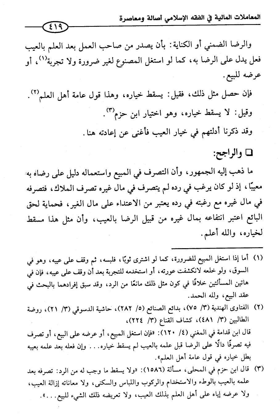 (¬٣) قال ابن حزم في المحلى، مسألة (١٥٨٦): "ولا يسقط ما وجب له من الرد: تصرفه بعد علمه بالعيب بالوطء والاستخدام والركوب واللباس والسكنى، ولا معاناته إزالة العيب، ولا عرضه إياه على أهل العلم بذلك العيب، ولا تعريضه ذلك الشيء للبيع ... ".