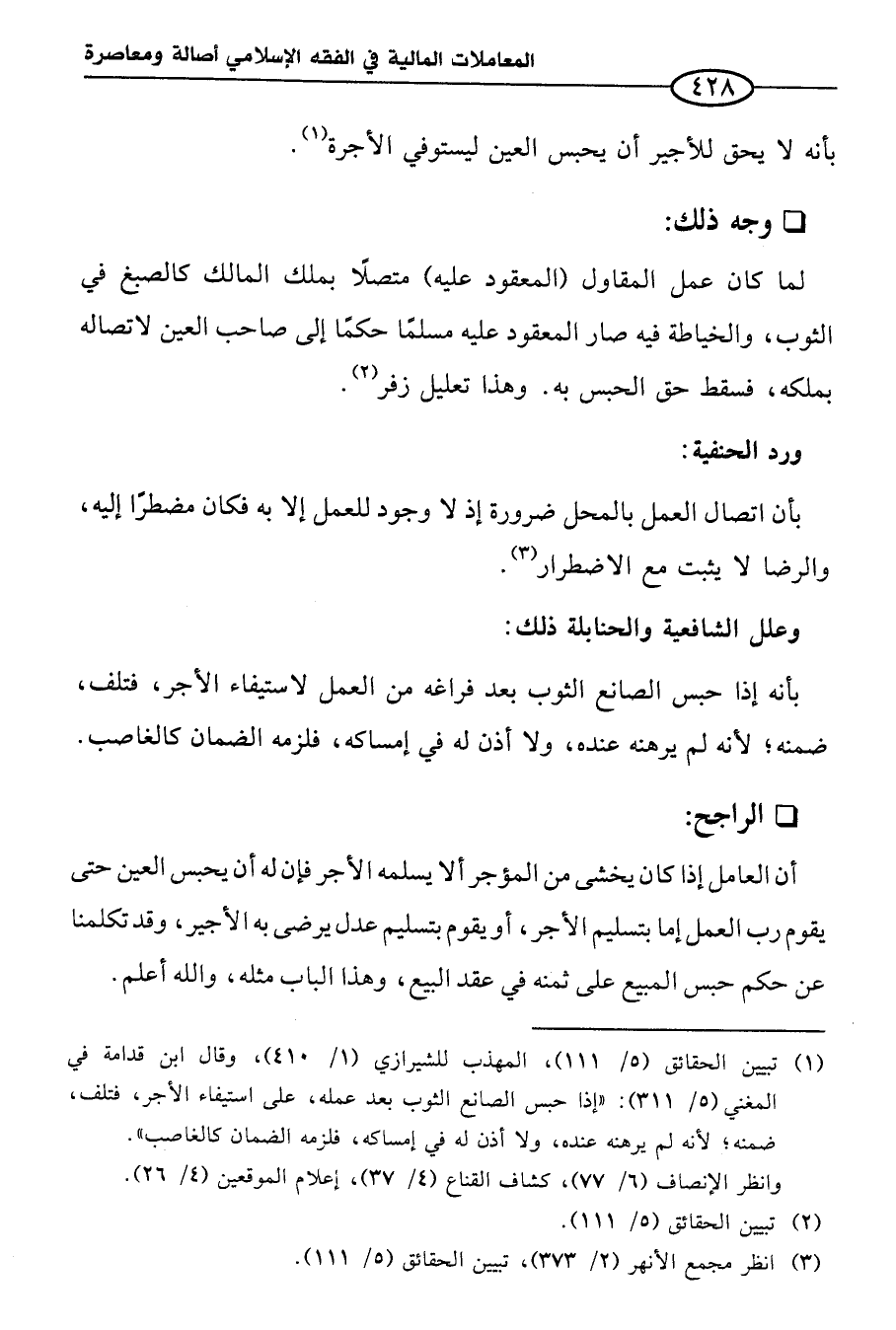 (¬١) تبيين الحقائق (٥/ ١١١)، المهذب للشيرازي (١/ ٤١٠)، وقال ابن قدامة في المغني (٥/ ٣١١): "إذا حبس الصانع الثوب بعد عمله، على استيفاء الأجر، فتلف، ضمنه؛ لأنه لم يرهنه عنده، ولا أذن له في إمساكه، فلزمه الضمان كالغاصب".