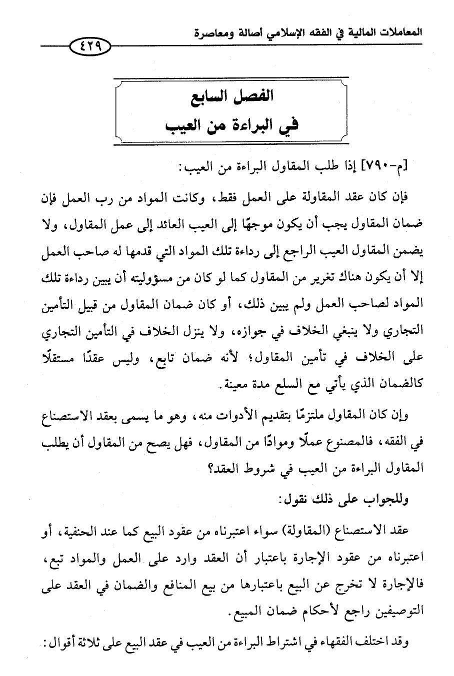وإن كان المقاول ملتزماً بتقديم الأدوات منه، وهو ما يسمى بعقد الاستصناع في الفقه، فالمصنوع عملاً ومواداً من المقاول، فهل يصح من المقاول أن يطلب المقاول البراءة من العيب في شروط العقد؟