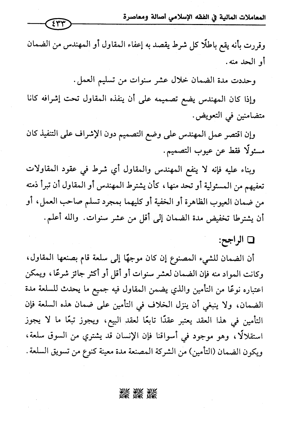 أن الضمان للشيء المصنوع إن كان موجهًا إلى سلعة قام بصنعها المقاول، وكانت المواد منه فإن الضمان لعشر سنوات أو أقل أو أكثر جائز شرعاً، ويمكن اعتباره نوعاً من التأمين والذي يضمن المقاول فيه جميع ما يحدث للسلعة مدة الضمان، ولا ينبغي أن ينزل الخلاف في التأمين على ضمان هذه السلعة فإن التأمين في هذا العقد يعتبر عقداً تابعًا لعقد البيع، ويجوز تبعًا ما لا يجوز استقلالاً، وهو موجود في أسواقنا فإن الإنسان قد يشتري من السوق سلعة، ويكون الضمان (التأمين) من الشركة المصنعة مدة معينة كنوع من تسويق السلعة.