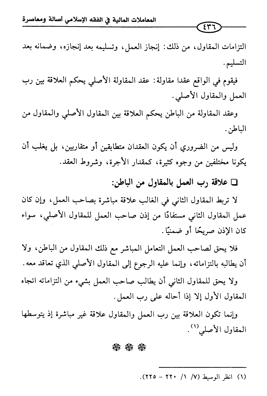 وإنما تكون العلاقة بين رب العمل والمقاول علاقة غير مباشرة إذ يتوسطها المقاول الأصلي (¬١).