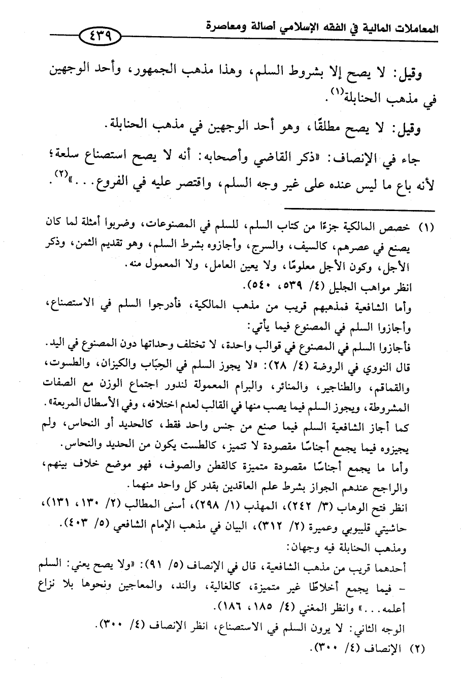 (¬١) خصص المالكية جزءاً من كتاب السلم، للسلم في المصنوعات، وضربوا أمثلة لما كان يصنع في عصرهم، كالسيف، والسرج، وأجازوه بشرط السلم، وهو تقديم الثمن، وذكر الأجل، وكون الأجل معلوماً, ولا يعين العامل، ولا المعمول منه.