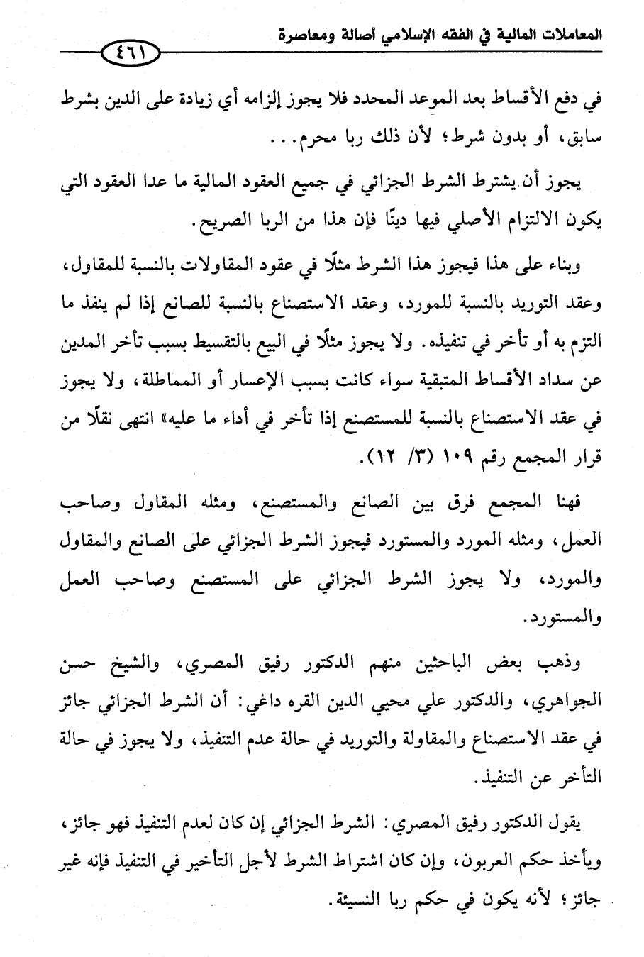 وبناء على هذا فيجوز هذا الشرط مثلاً في عقود المقاولات بالنسبة للمقاول، وعقد التوريد بالنسبة للمورد، وعقد الاستصناع بالنسبة للصانع إذا لم ينفذ ما التزم به أو تأخر في تنفيذه. ولا يجوز مثلاً في البيع بالتقسيط بسبب تأخر المدين عن سداد الأقساط المتبقية سواء كانت بسبب الإعسار أو المماطلة، ولا يجوز في عقد الاستصناع بالنسبة للمستصنع إذا تأخر في أداء ما عليه، انتهى نقلاً من قرار المجمع رقم ١٠٩ (٣/ ١٢).