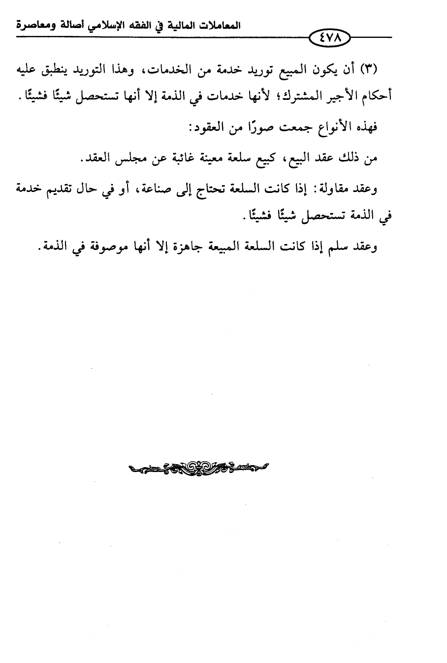 (٣) أن يكون المبيع توريد خدمة من الخدمات، وهذا التوريد ينطبق عليه أحكام الأجير المشترك؛ لأنها خدمات في الذمة إلا أنها تستحصل شيئًا فشيئًا.