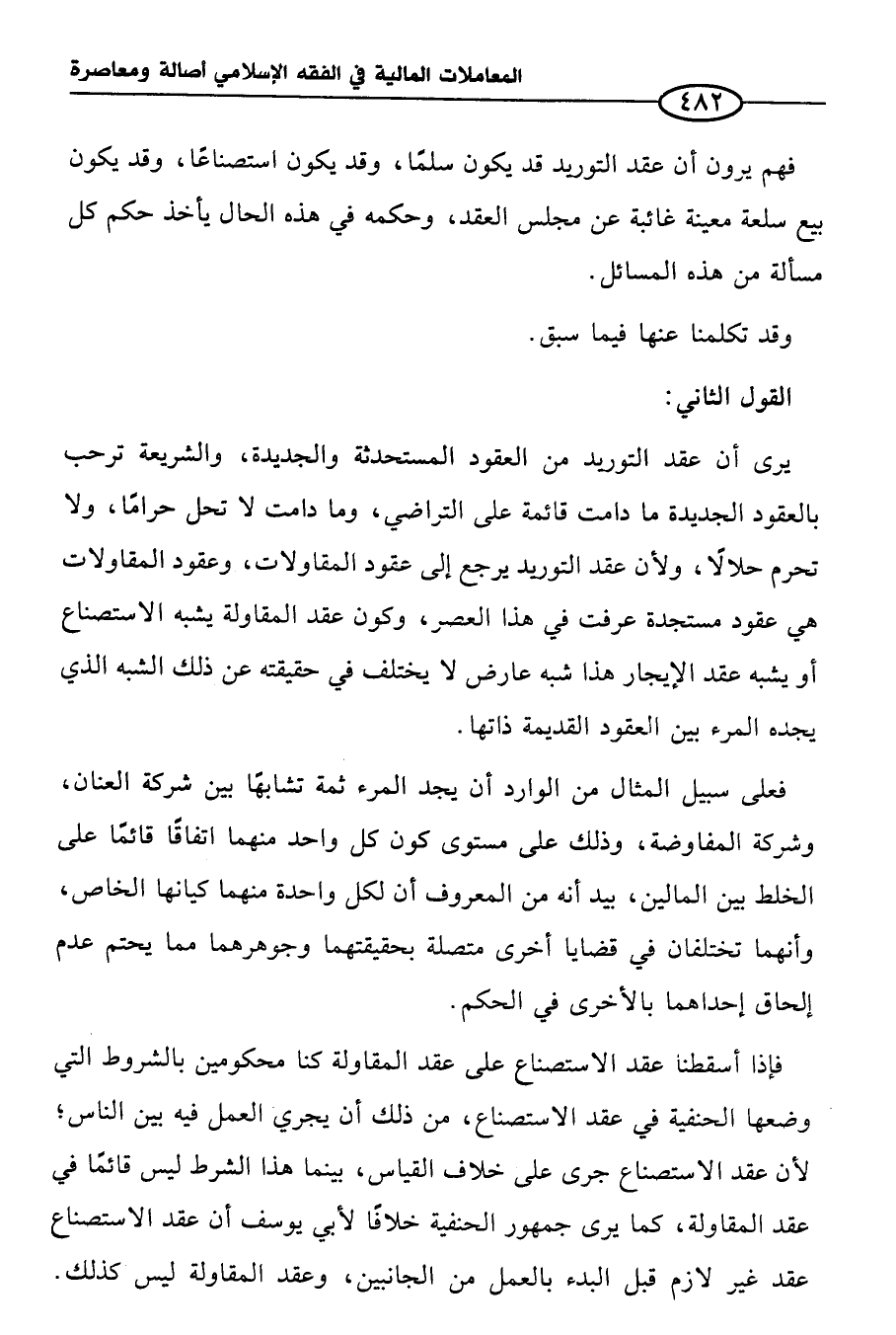يرى أن عقد التوريد من العقود المستحدثة والجديدة، والشريعة ترحب بالعقود الجديدة ما دامت قائمة على التراضي، وما دامت لا تحل حرامًا, ولا تحرم حلالاً، ولأن عقد التوريد يرجع إلى عقود المقاولات، وعقود المقاولات هي عقود مستجدة عرفت في هذا العصر، وكون عقد المقاولة يشبه الاستصناع أو يشبه عقد الإيجار هذا شبه عارض لا يختلف في حقيقته عن ذلك الشبه الذي يجده المرء بين العقود القديمة ذاتها.