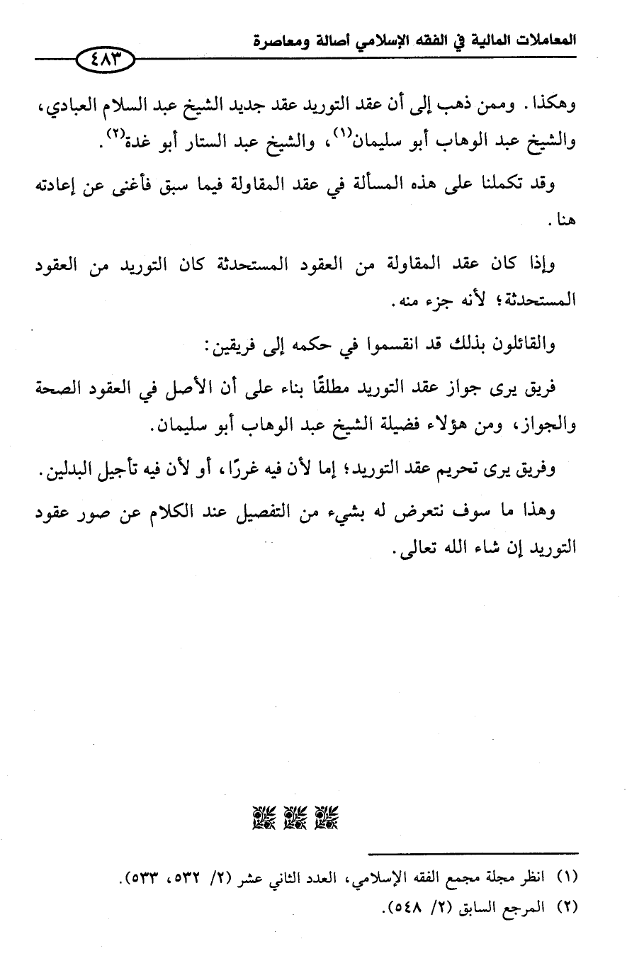 وهكذا. وممن ذهب إلى أن عقد التوريد عقد جديد الشيخ عبد السلام العبادي، والشيخ عبد الوهاب أبو سليمان (¬١)، والشيخ عبد الستار أبو غدة (¬٢).