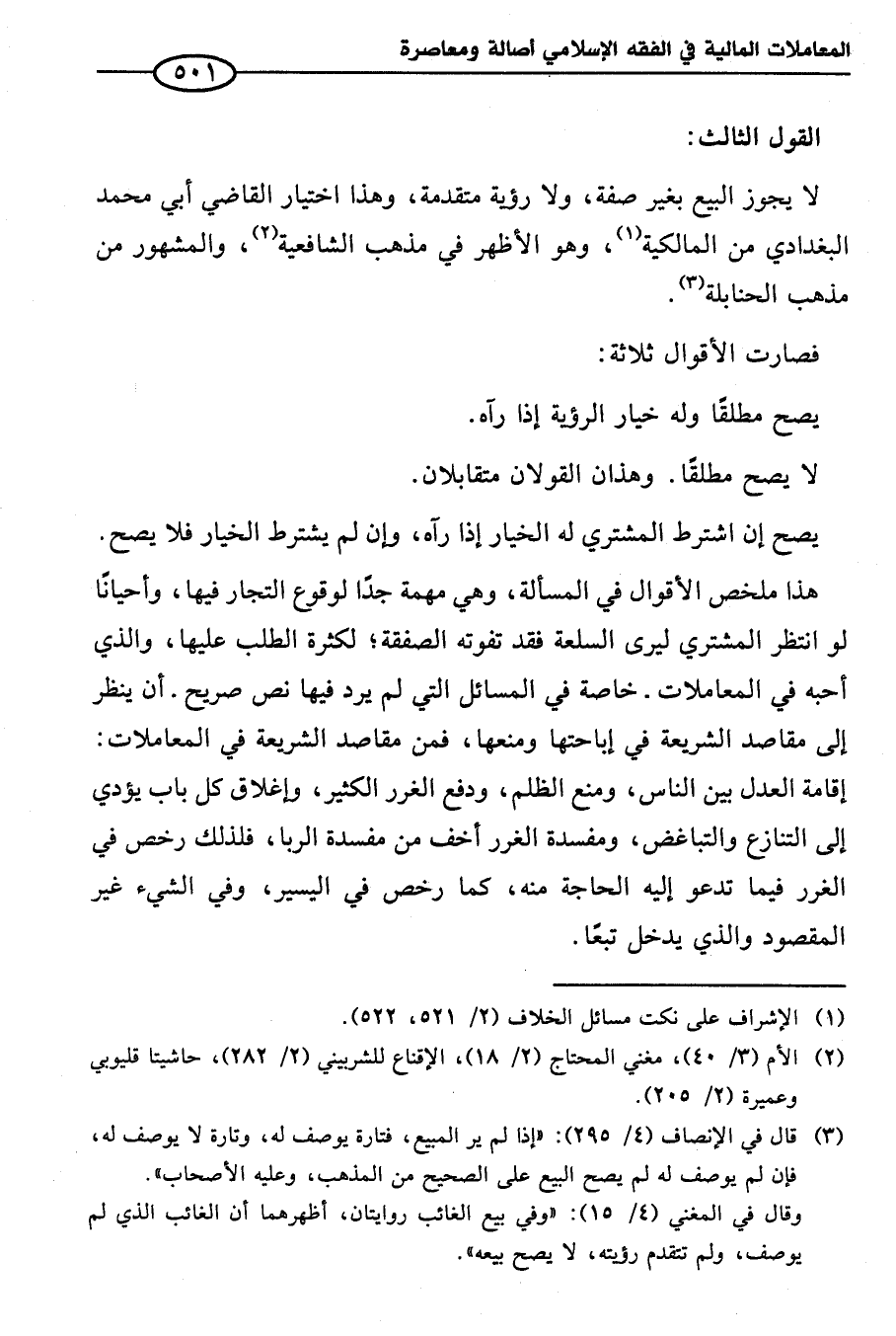 هذا ملخص الأقوال في المسألة، وهي مهمة جدًا لوقوع التجار فيها، وأحيانًا لو انتظر المشتري ليرى السلعة فقد تفوته الصفقة؛ لكثرة الطلب عليها، والذي أحبه في المعاملات. خاصة في المسائل التي لم يرد فيها نص صريح. أن ينظر إلى مقاصد الشريعة في إباحتها ومنعها، فمن مقاصد الشريعة في المعاملات: إقامة العدل بين الناس، ومنع الظلم، ودفع الغرر الكثير، وإغلاق كل باب يؤدي إلى التنازع والتباغض، ومفسدة الغرر أخف من مفسدة الربا، فلذلك رخص في الغرر فيما تدعو إليه الحاجة منه، كما رخص في اليسير، وفي الشيء غير المقصود والذي يدخل تبعًا.