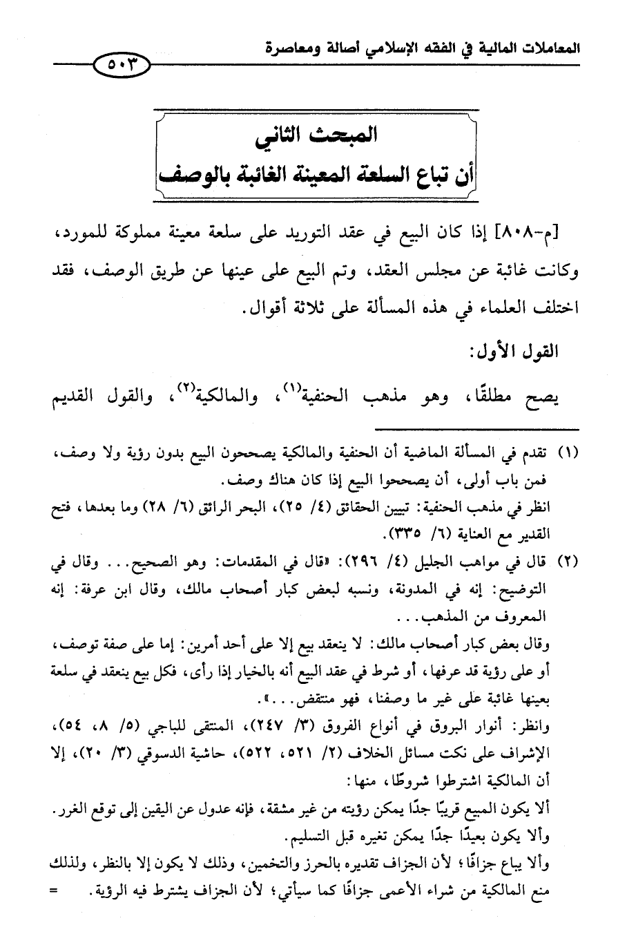المبحث الثاني أن تباع السلعة المعينة الغائبة بالوصف