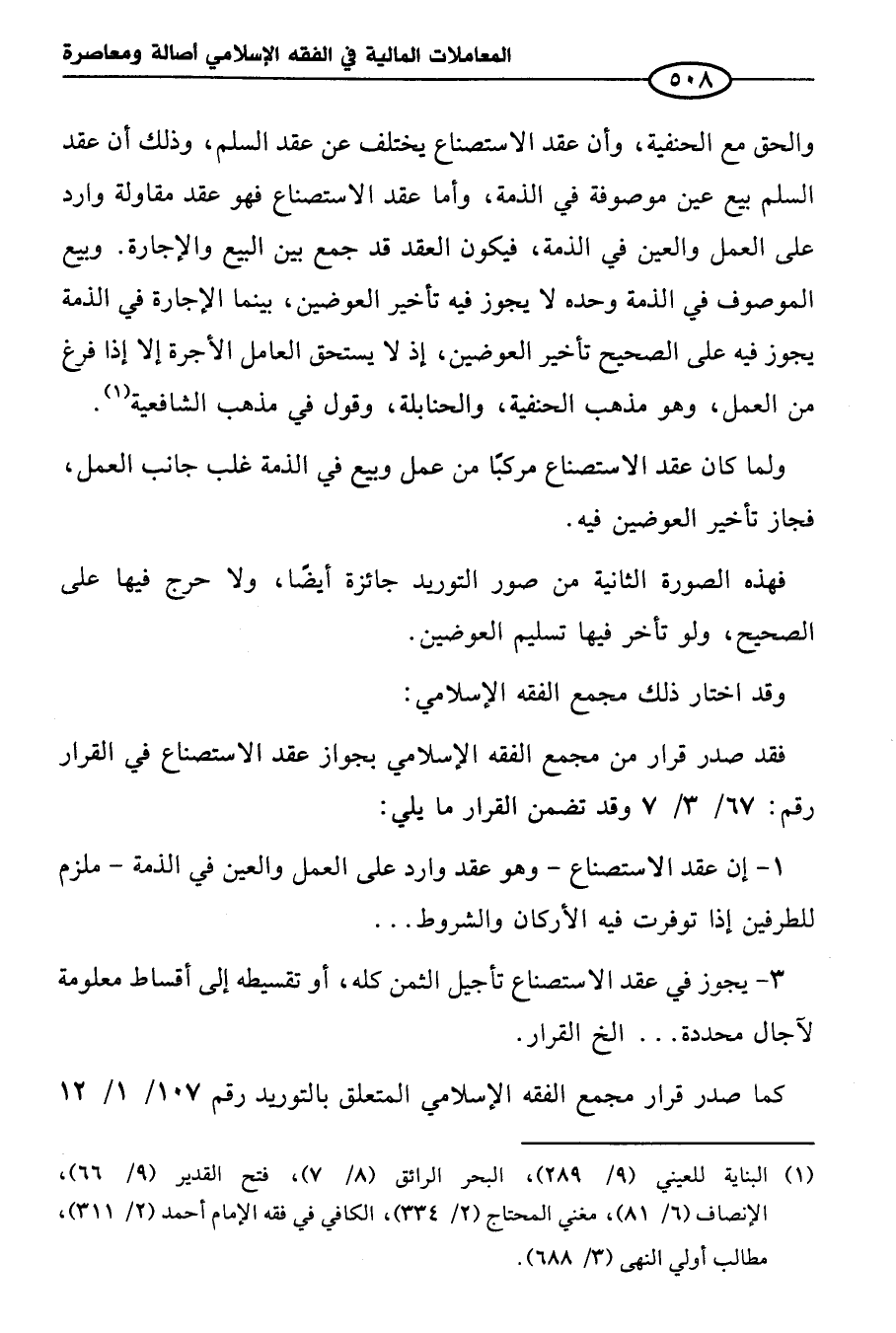 ٢ - يجوز في عقد الاستصناع تأجيل الثمن كله، أو تقسيطه إلى أقساط معلومة لآجال محددة ... الخ القرار.