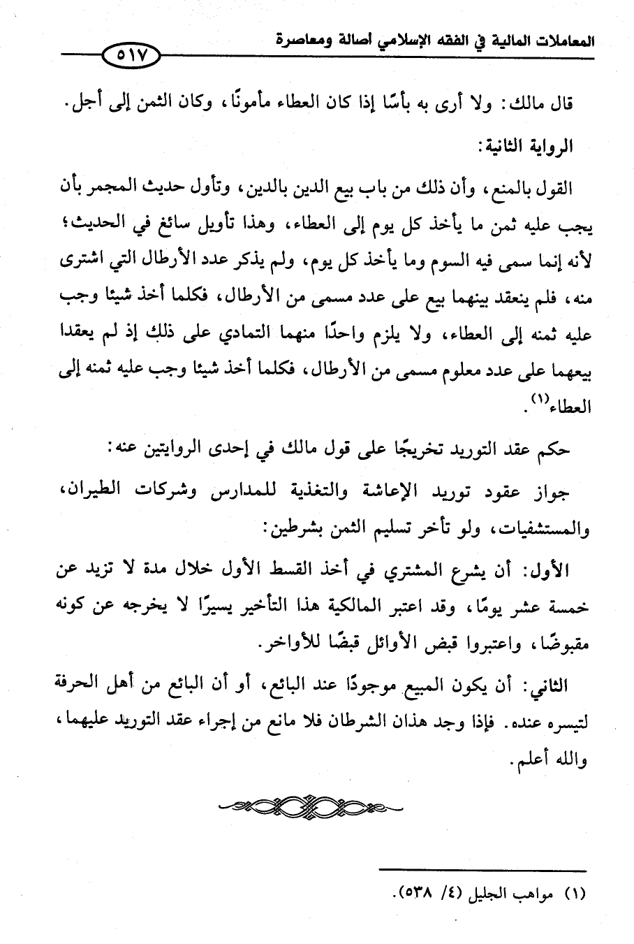 حكم عقد التوريد تخريجاً على قول مالك في إحدى الروايتين عنه: