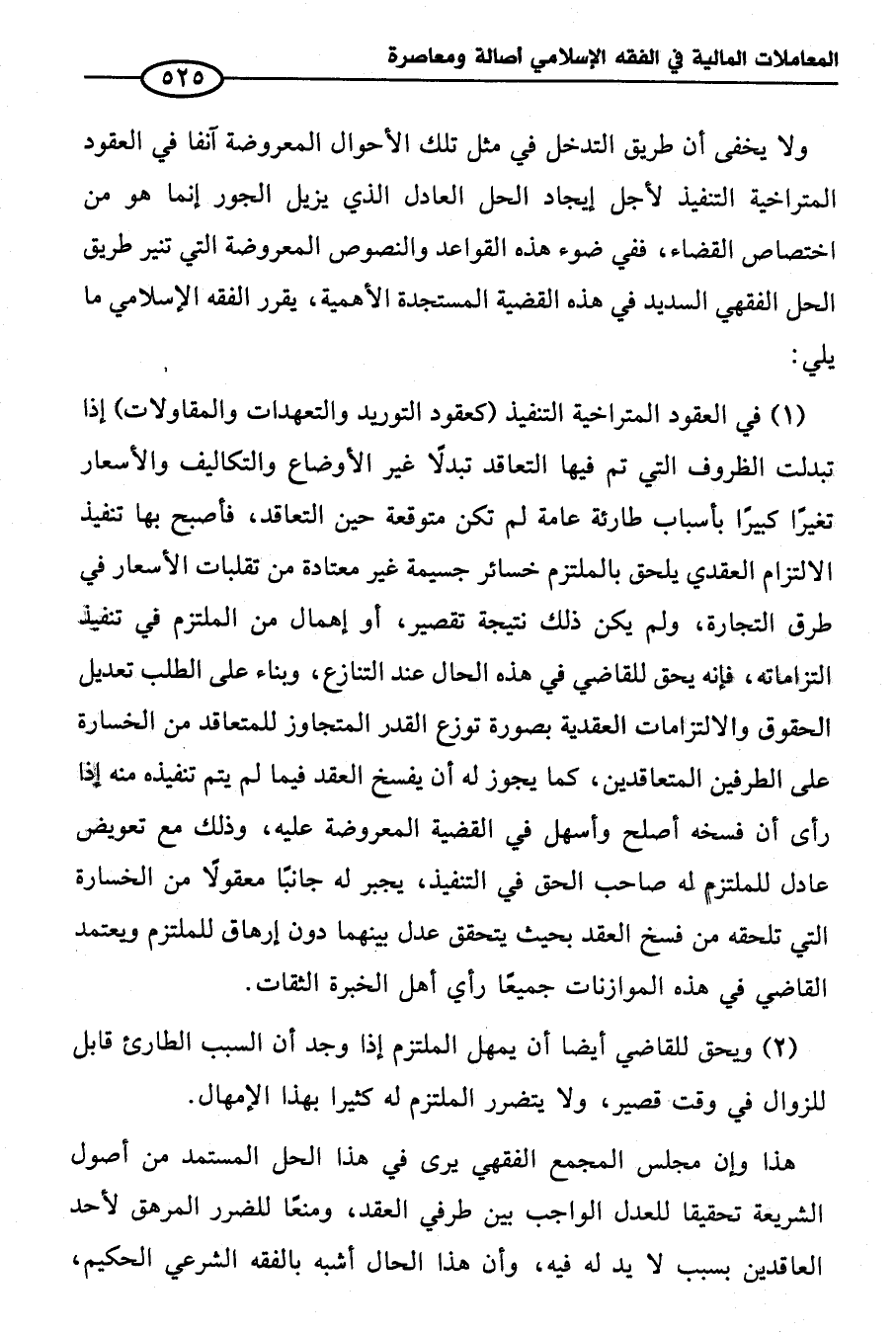 هذا وإن مجلس المجمع الفقهي يرى في هذا الحل المستمد من أصول الشريعة تحقيقاً للعدل الواجب بين طرفي العقد، ومنعًا للضرر المرهق لأحد العاقدين بسبب لا يد له فيه، وأن هذا الحال أشبه بالفقه الشرعي الحكيم،