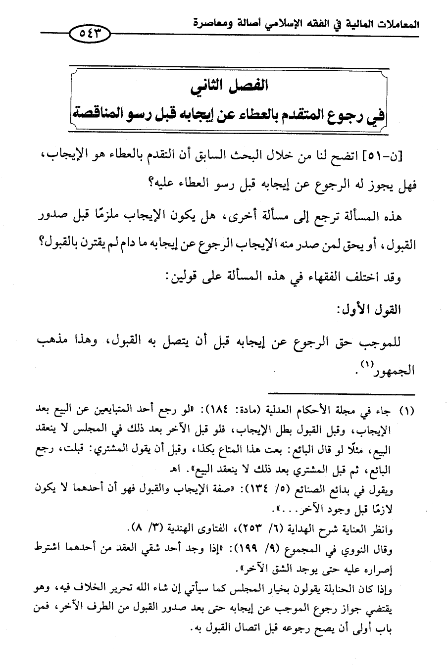(¬١) جاء في مجلة الأحكام العدلية (مادة: ١٨٤): "لو رجع أحد المتبايعين عن البيع بعد الإيجاب، وقبل القبول بطل الإيجاب، فلو قبل الآخر بعد ذلك في المجلس لا ينعقد البيع، مثلا لو قال البائع: بعت هذا المتاع بكذا، وقبل أن يقول المشتري: قبلت، رجع البائع، ثم قبل المشتري بعد ذلك لا ينعقد البيع". اهـ