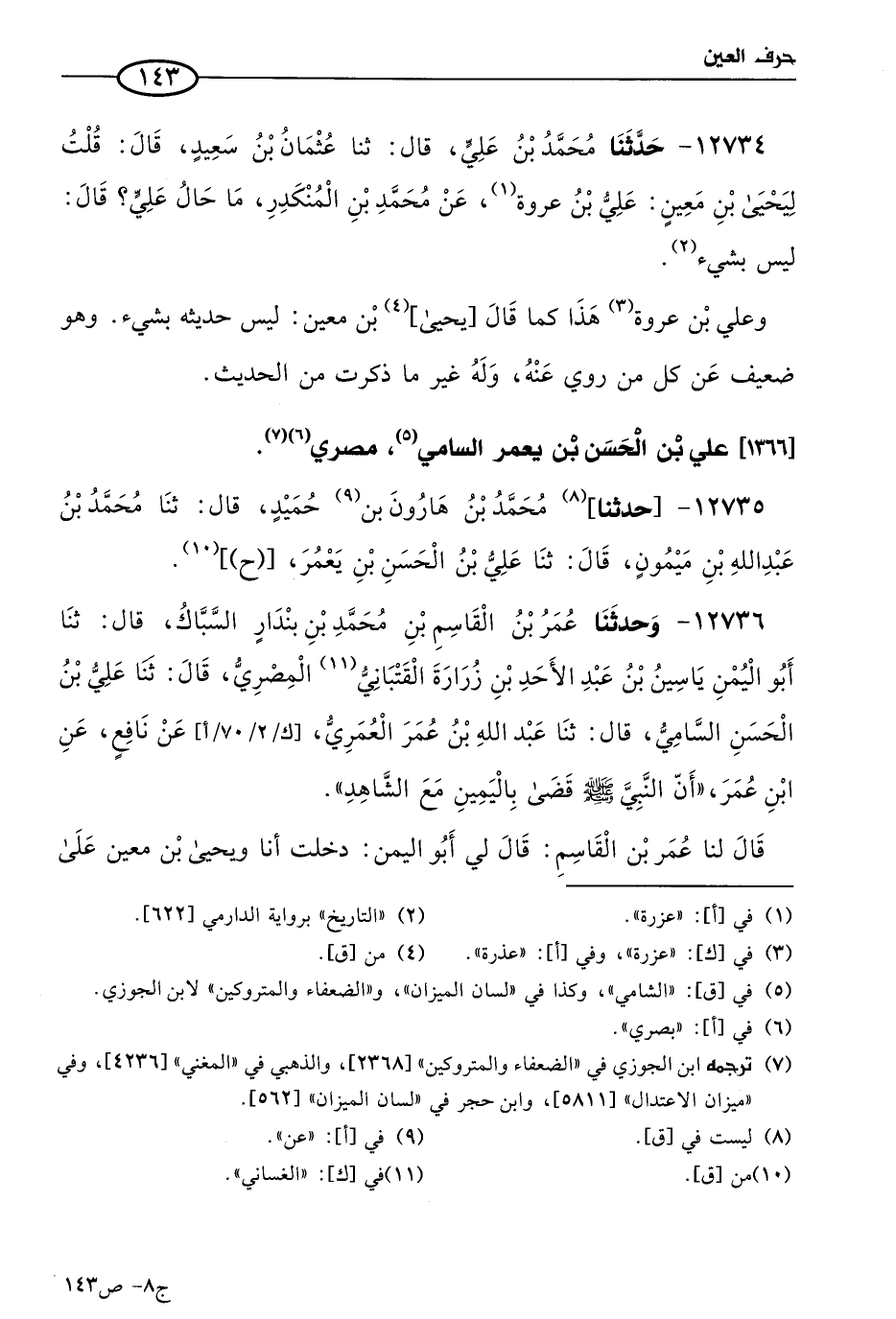 12734 - حَدثنا مُحمد بن علي، قال: حَدثنا عثمان بن سعيد، قال: قلتُ ليحيى بن مَعين: علي بن عروة عن مُحمد بن المنكدر، ما حال علي؟ قال: ليس بشَيءٍ.